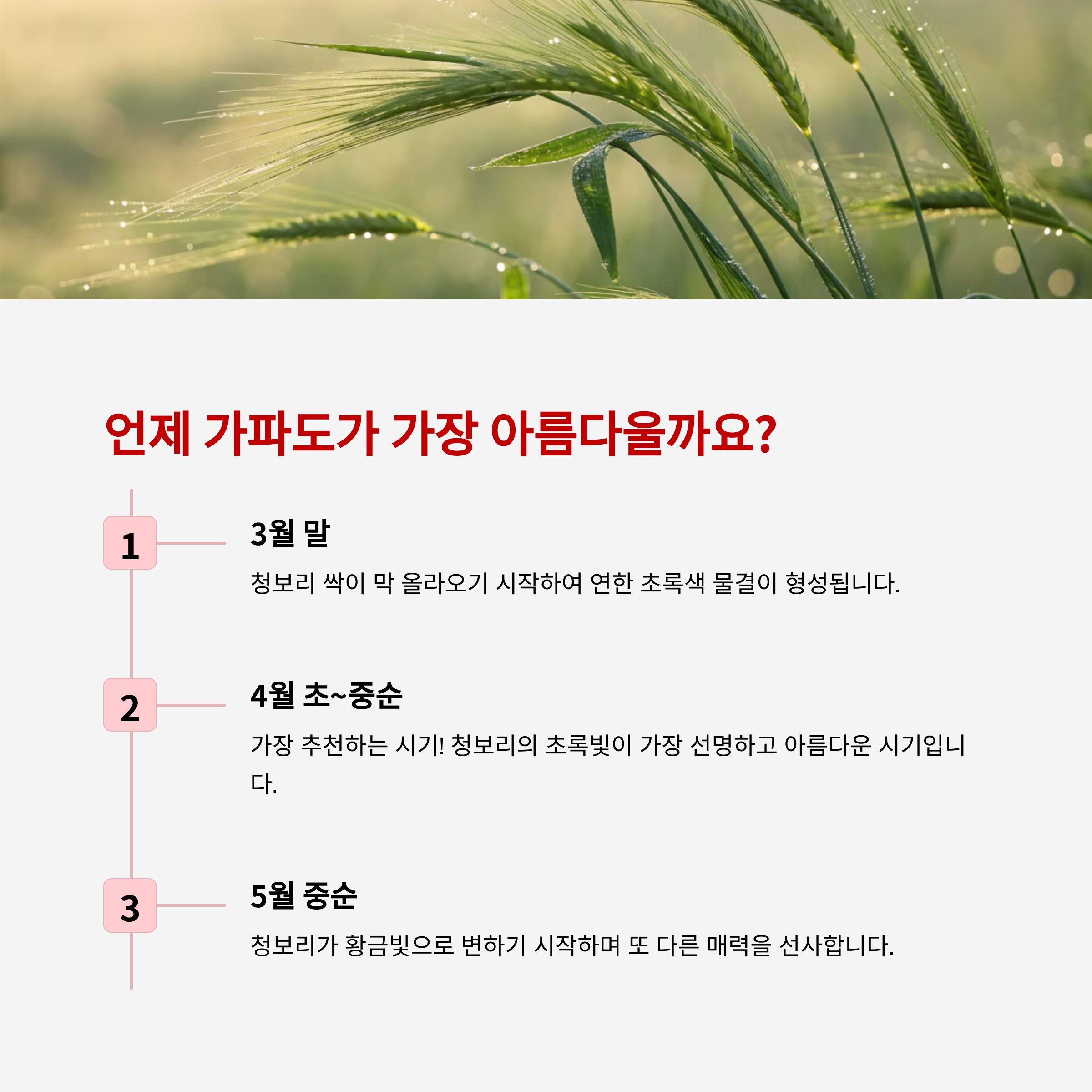 특히, 4월 초부터 4월 중순이 절경의 정점이며 봄 내음 가득한 보리밭 산책을 즐기기에 안성맞춤입니다.