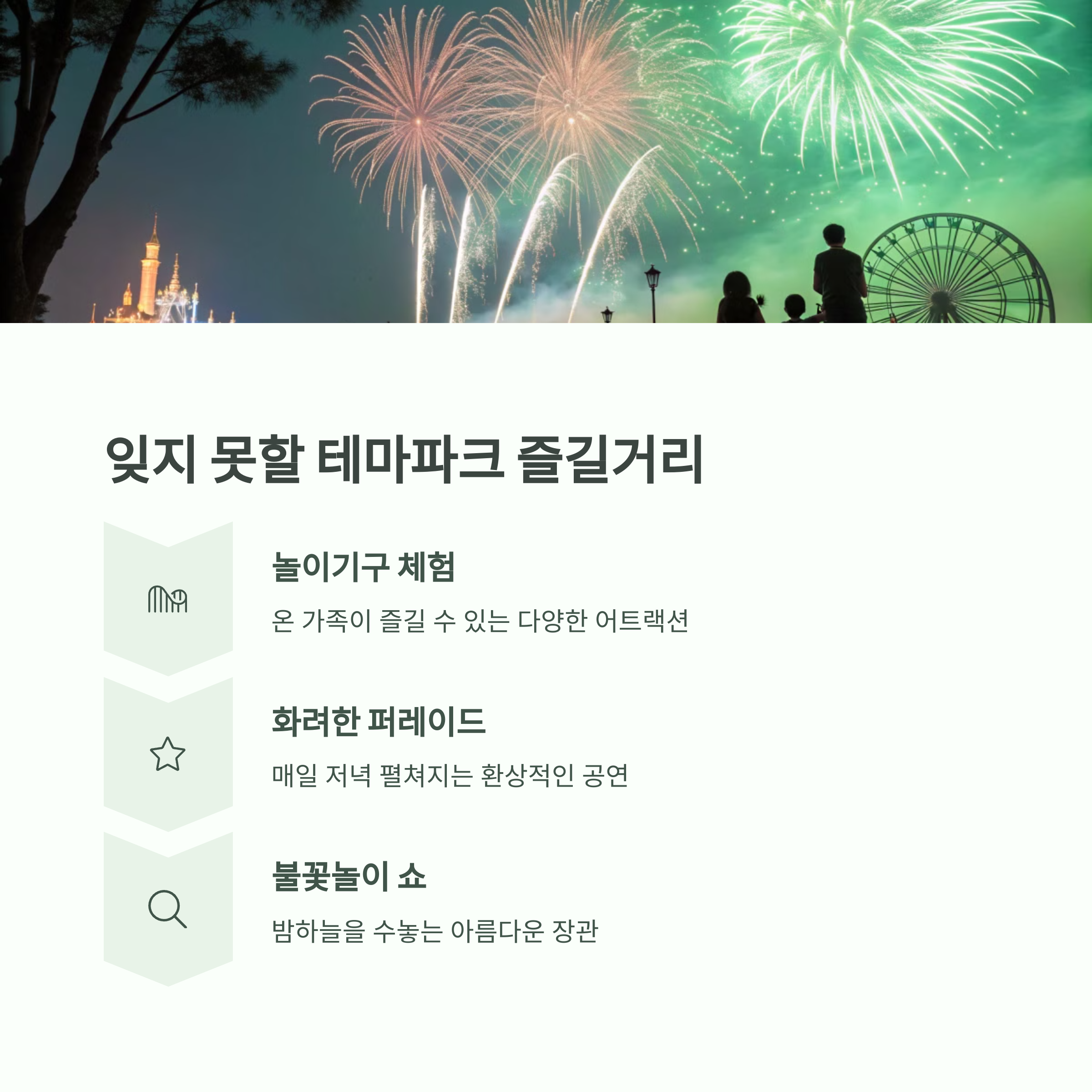 특히, 매일 열리는 저녁 퍼레이드와 불꽃놀이는 방문객들에게 환상적인 경험을 제공합니다.