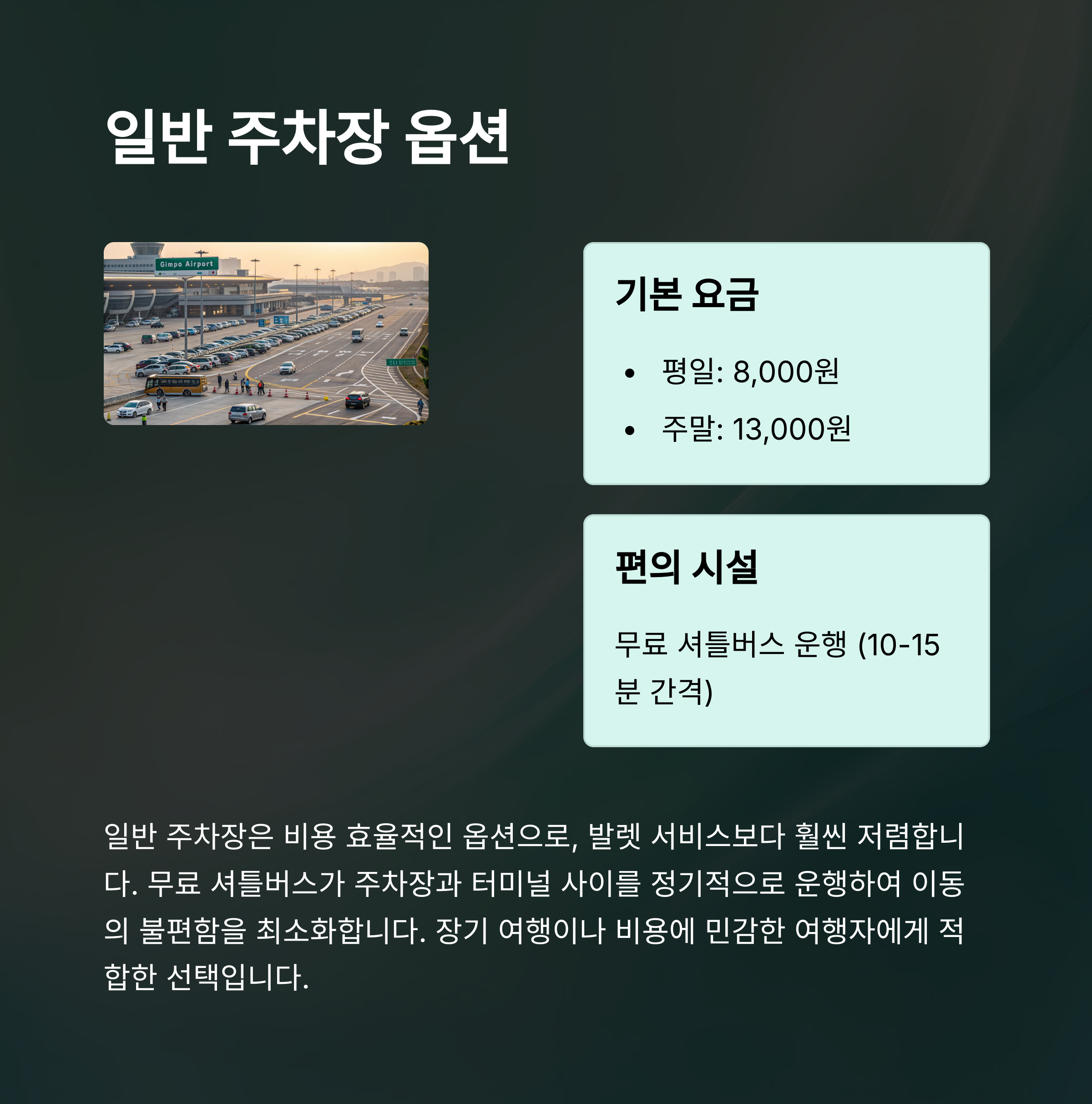 중요한 점은, 일반 주차장에는 김포공항에서 제공하는 셔틀버스 서비스를 이용해야 하므로, 짐이 많거나 이동 시간이 촉박한 경우 단점으로 작용할 수 있습니다.