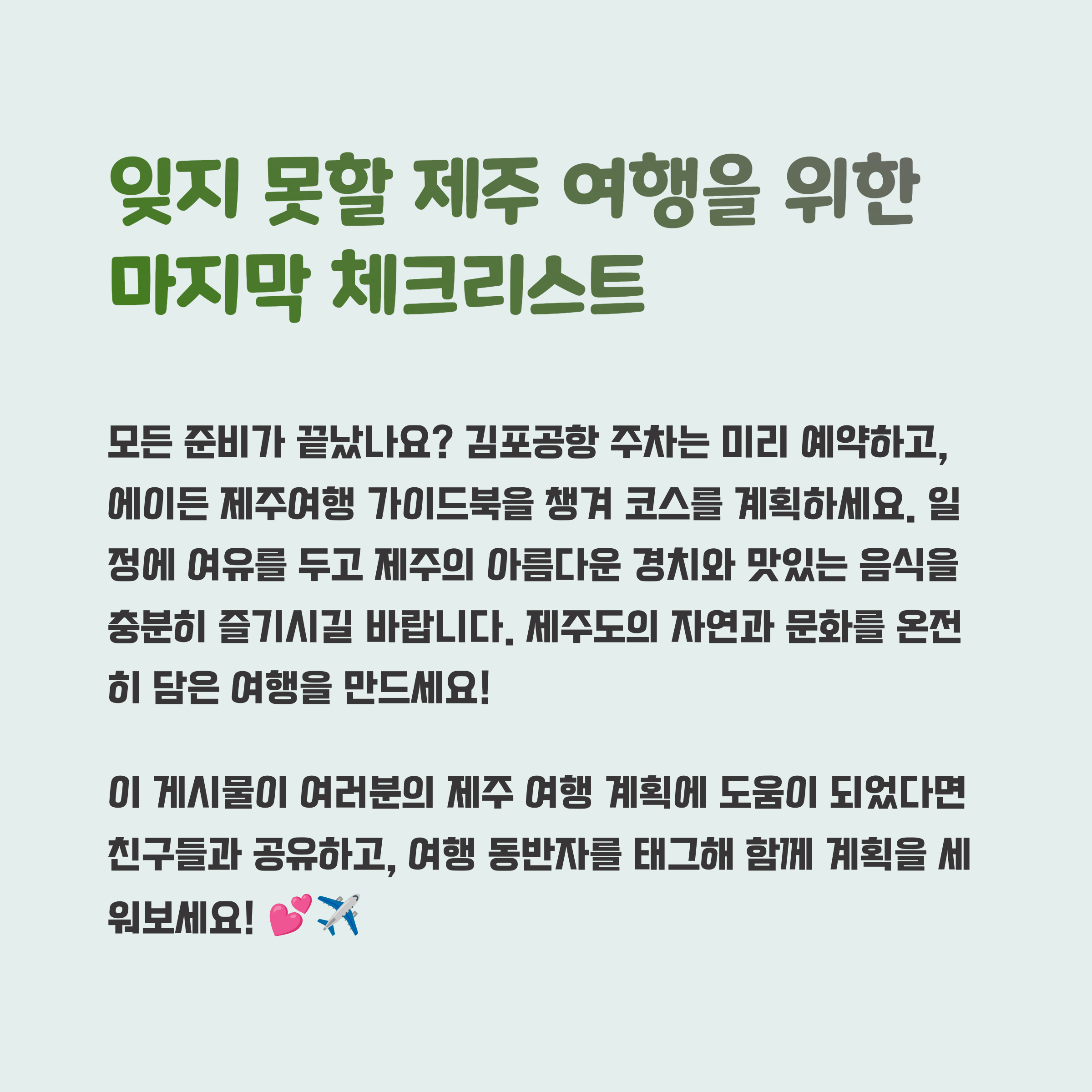 제주도의 아름다운 풍경을 충분히 즐길 준비가 되셨다면 이제 떠날 시간입니다!