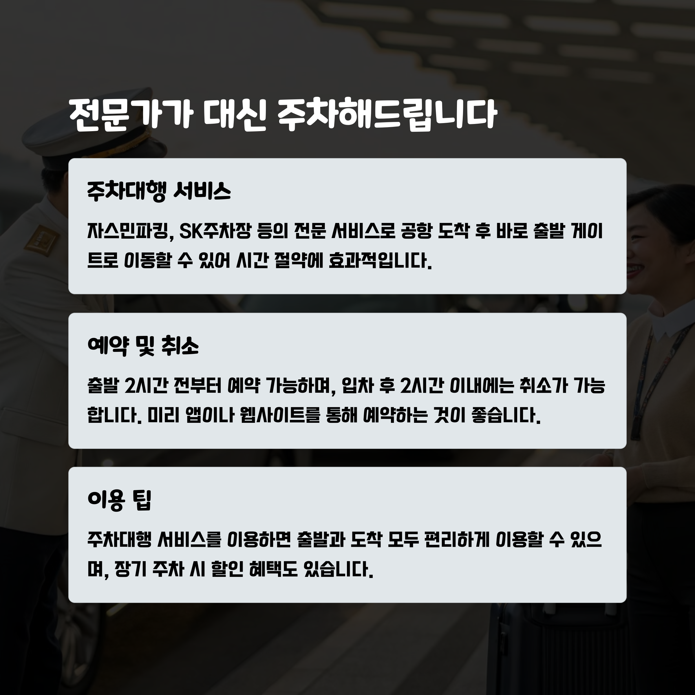 주차대행 서비스는 반드시 하루 전 예약이 필요하며, 출국 당일 지정된 장소에서 차량을 맡길 수 있습니다.