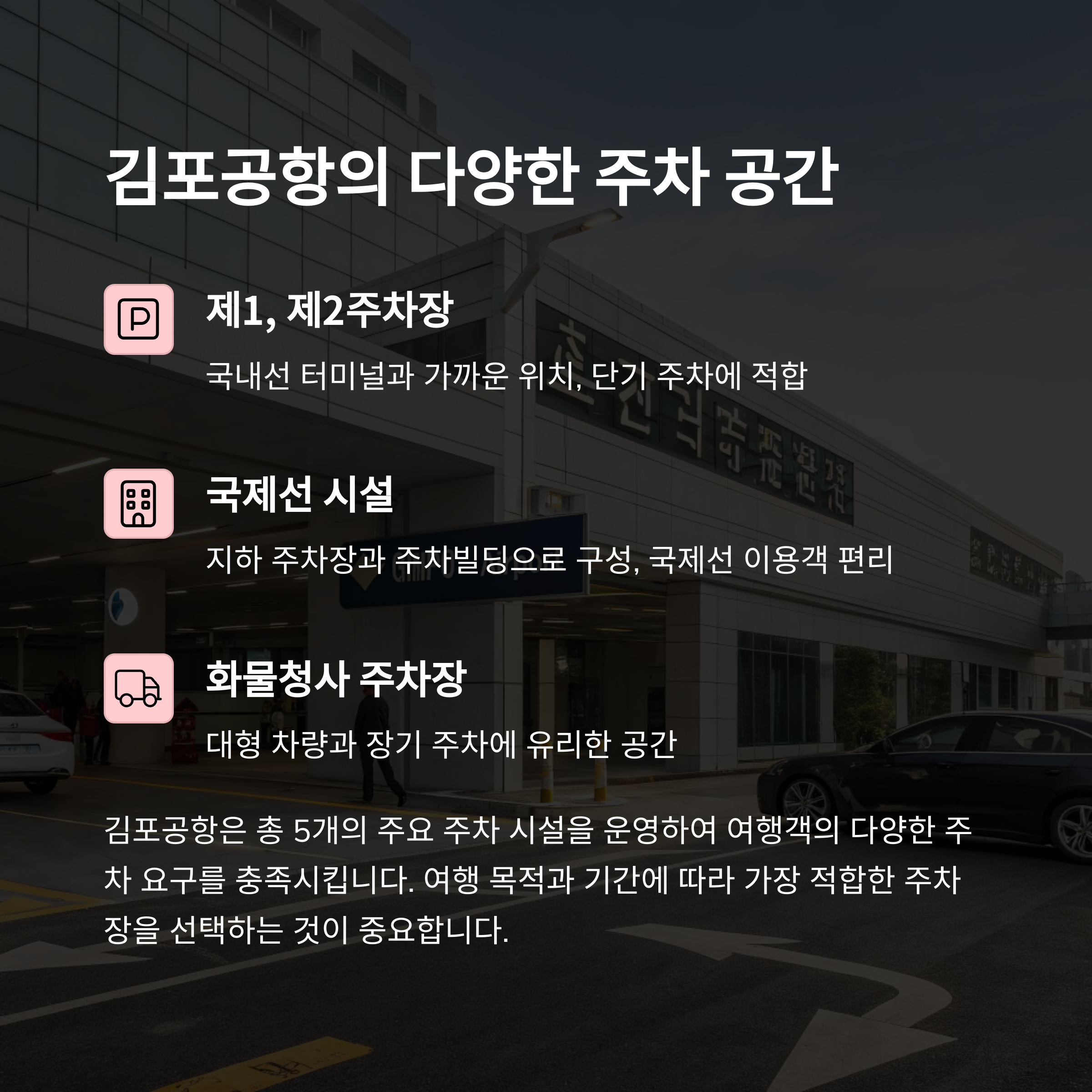 김포공항 주차는 대표적으로 공항 내부 주차장 4곳과 공식 및 독립 주차대행 서비스를 통해 가능합니다.