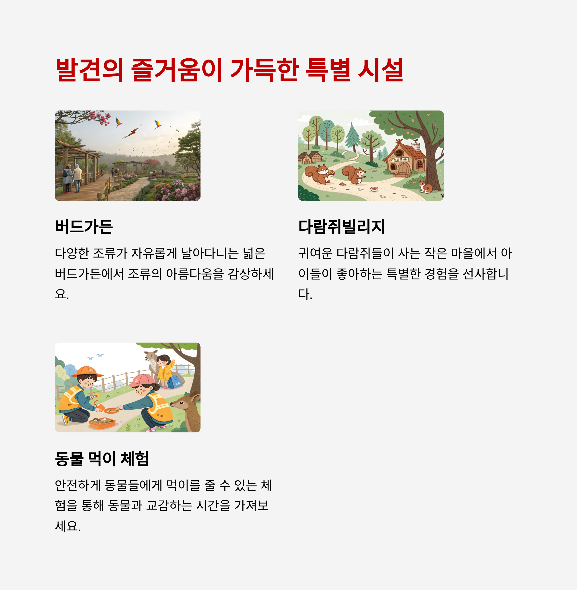 실내외로 다양한 동물 먹이 체험도 마련되어 있어 다른 곳에서 느낄 수 없는 재미를 제공합니다.