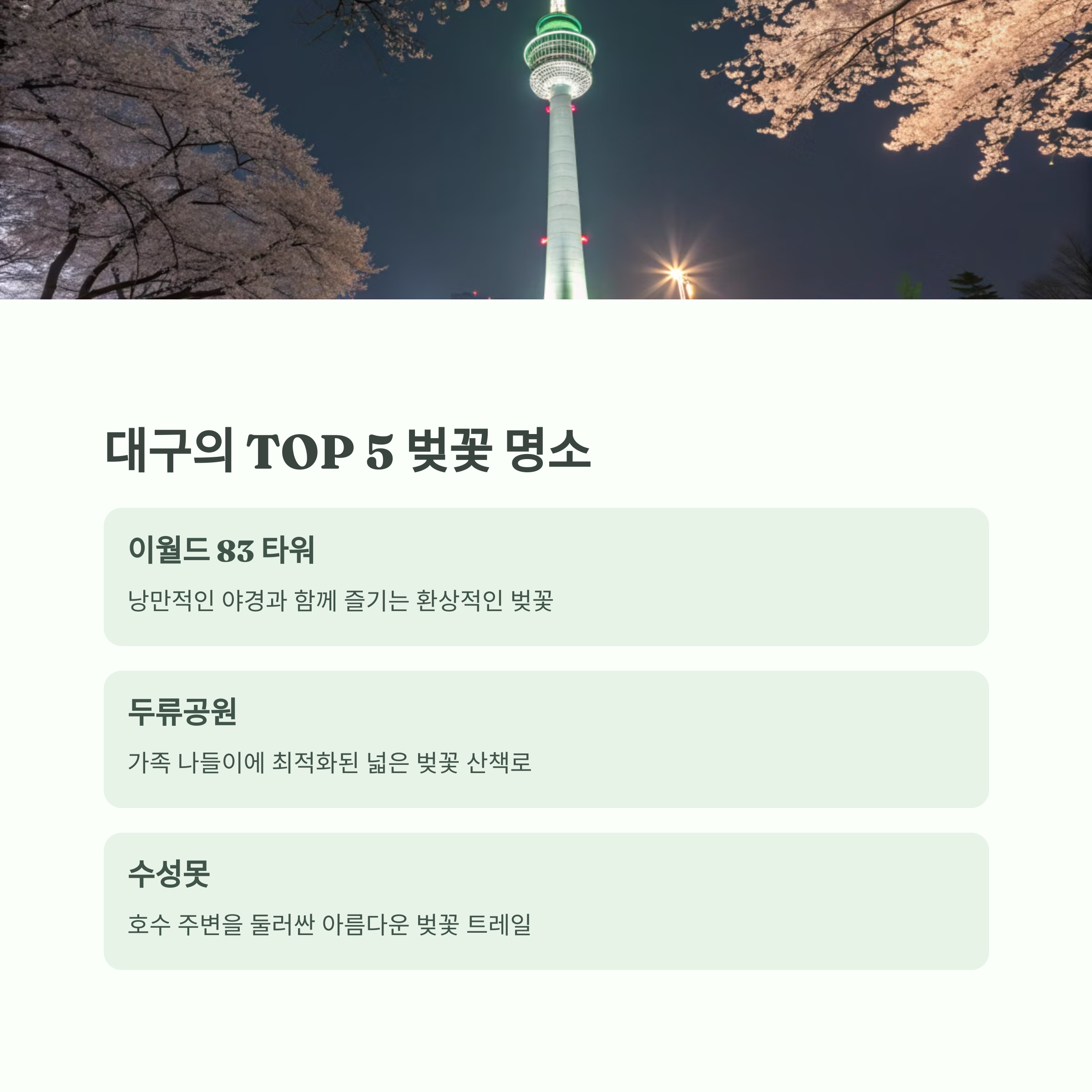 특히 이월드에서는 야경과 함께 로맨틱한 벚꽃 분위기를 감상할 수 있으며, 두류공원은 대규모 벚꽃 군락지로 산책하기 좋은 장소입니다.