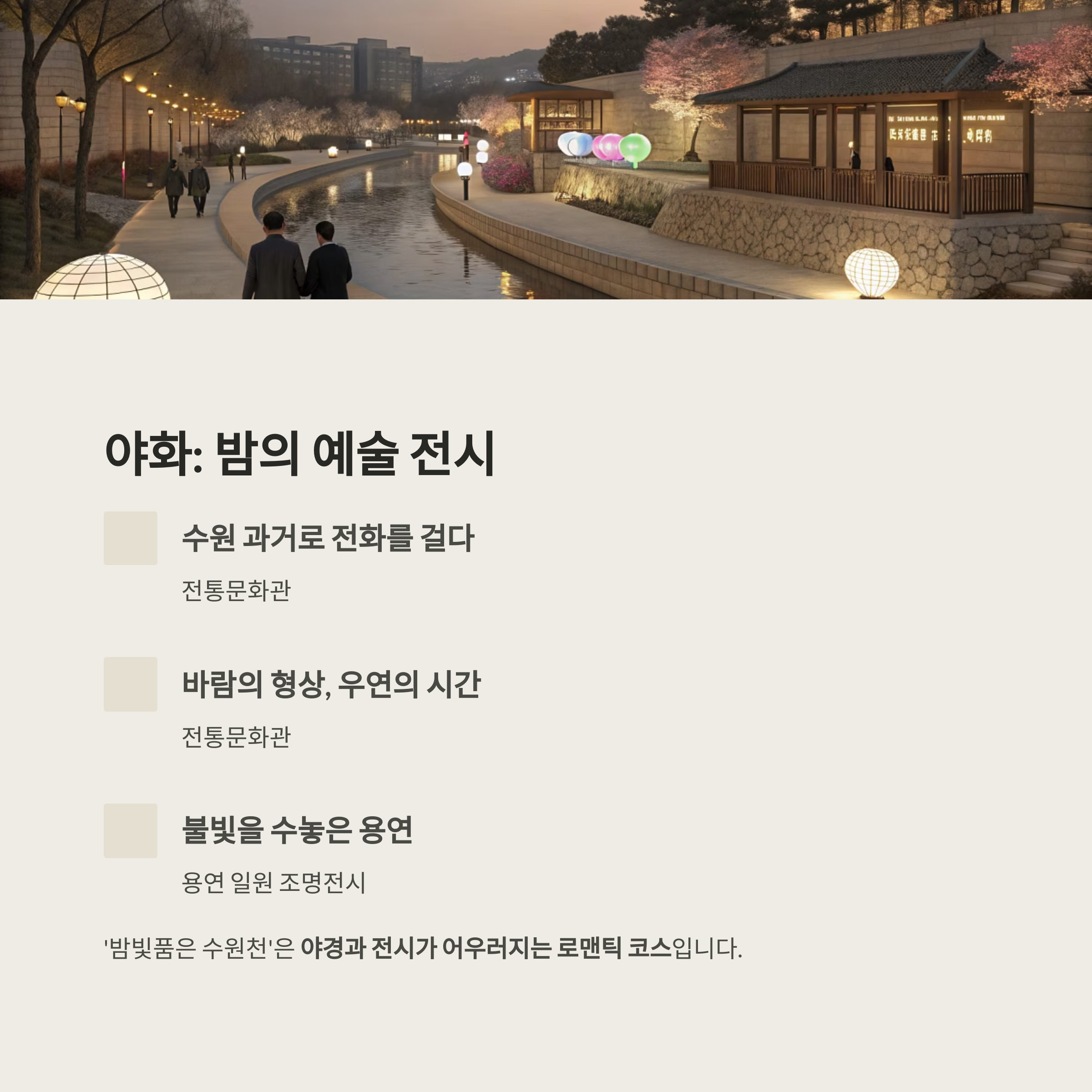 특히 ‘밤빛품은 수원천’은 야경과 전시가 함께 어우러지는 로맨틱 코스로,