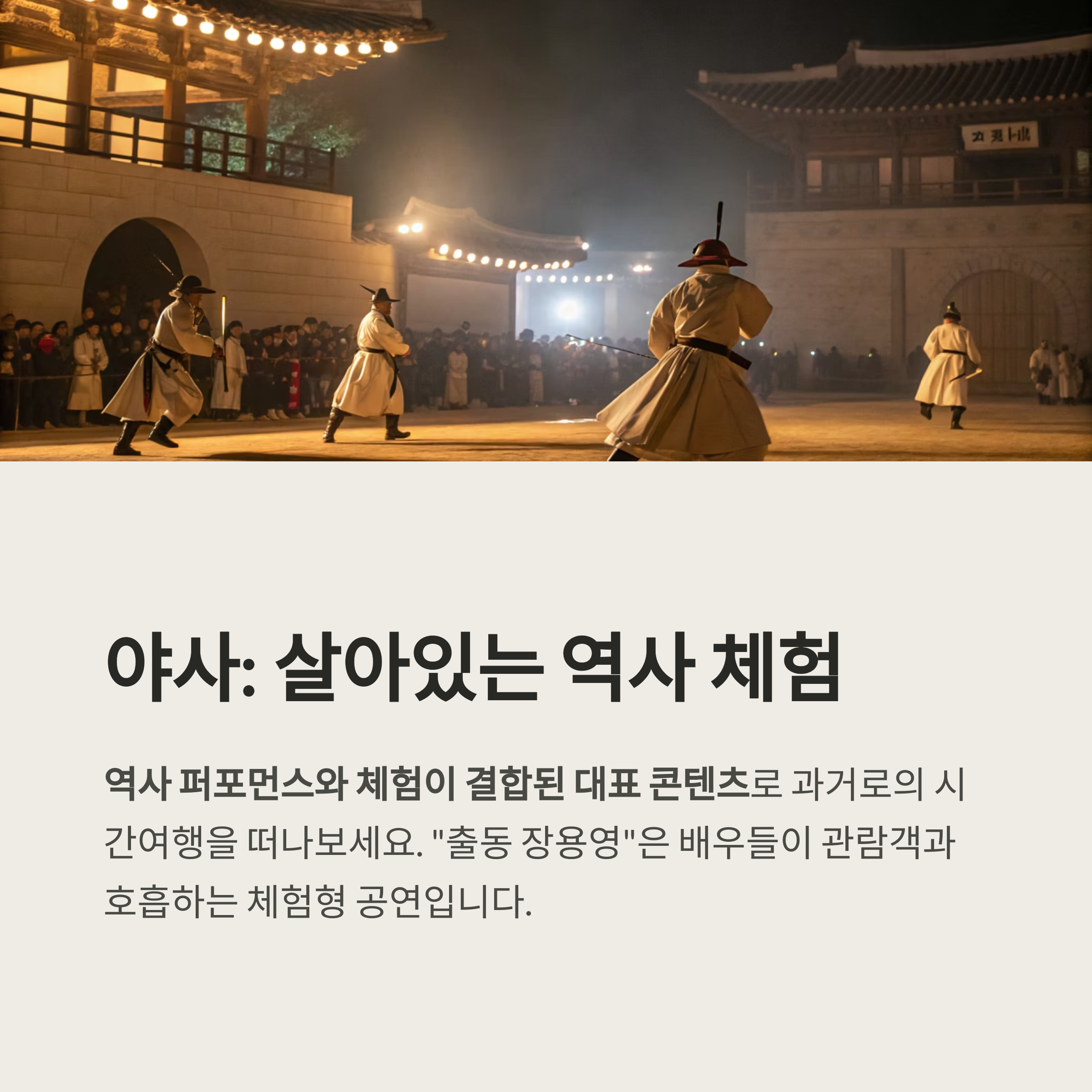 야사(夜史)는 역사 퍼포먼스와 체험이 결합된 대표 콘텐츠입니다.