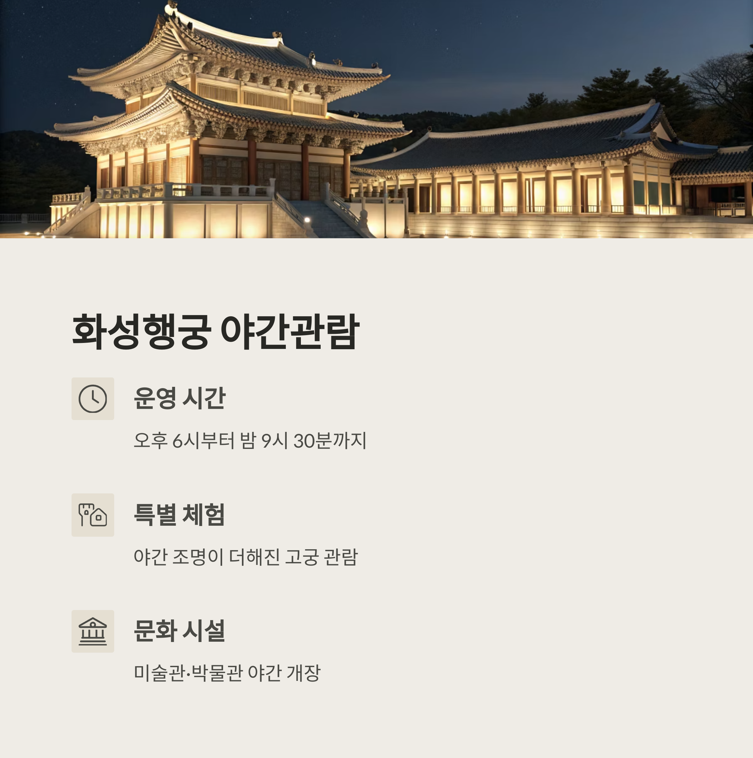 조용히 빛나는 화성행궁에서의 야간 관람은 야행의 대표 명소입니다.