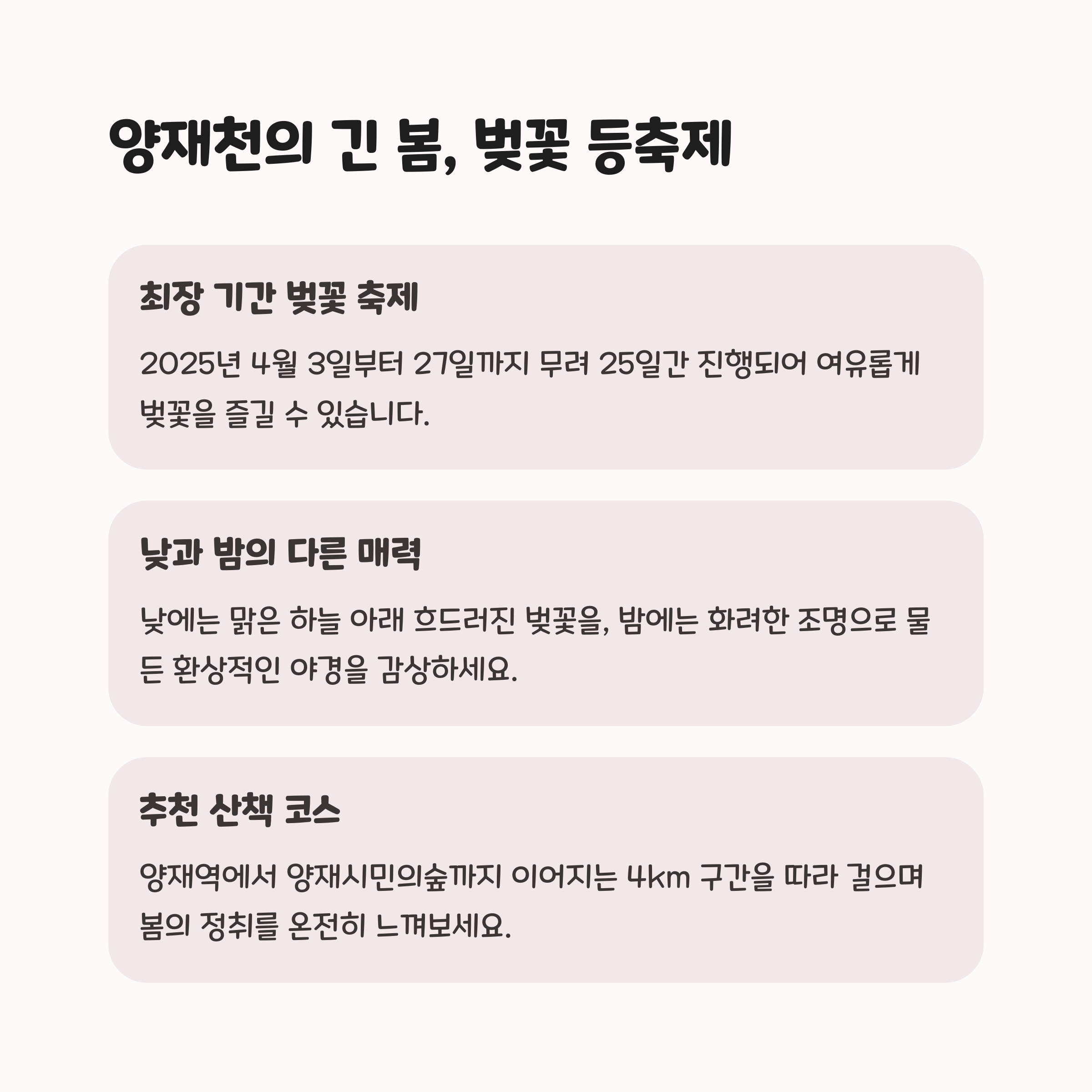 | 서울의 주요 벚꽃 축제는 위치와 특징에서 차이가 있습니다. 서울 그랜드파크는 늦게 피는 벚꽃으로 유명하며 야경과 공연을 즐길 수 있는 곳입니다. 석촌호수 벚꽃 축제는 호수 주변의 벚꽃 풍경이 매력적입니다. 여의도 윤중로는 서울에서 가장 긴 벚꽃길로 웅장함을 자랑합니다. 양재천 벚꽃 등축제는 길게 이어지는 축제 일정 동안 야경 경관이 추천할만한 포인트입니다. |