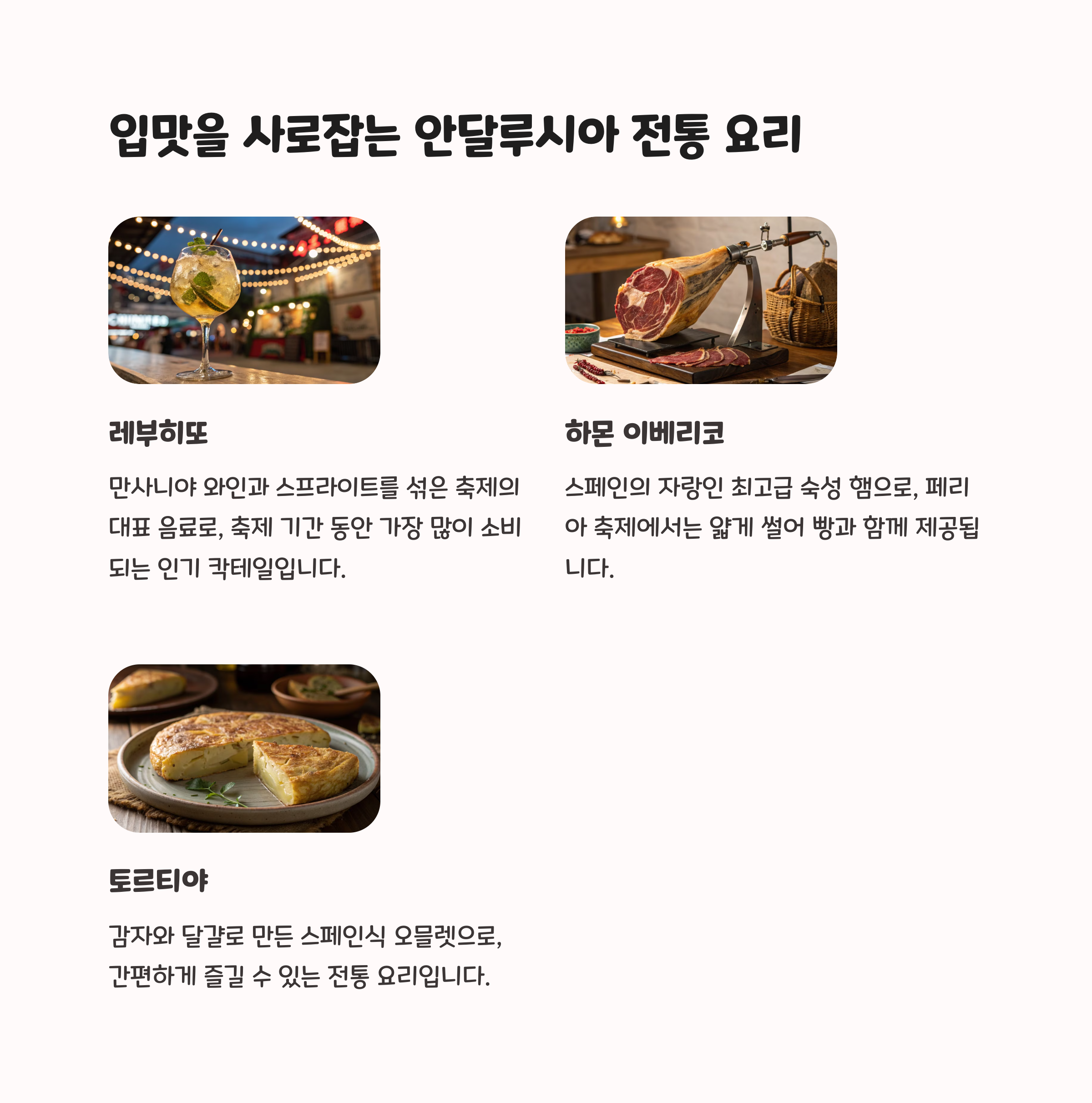 | 전통 음악 공연 | 하몬 이베리코 | 세비야나스 | 페리아장 |