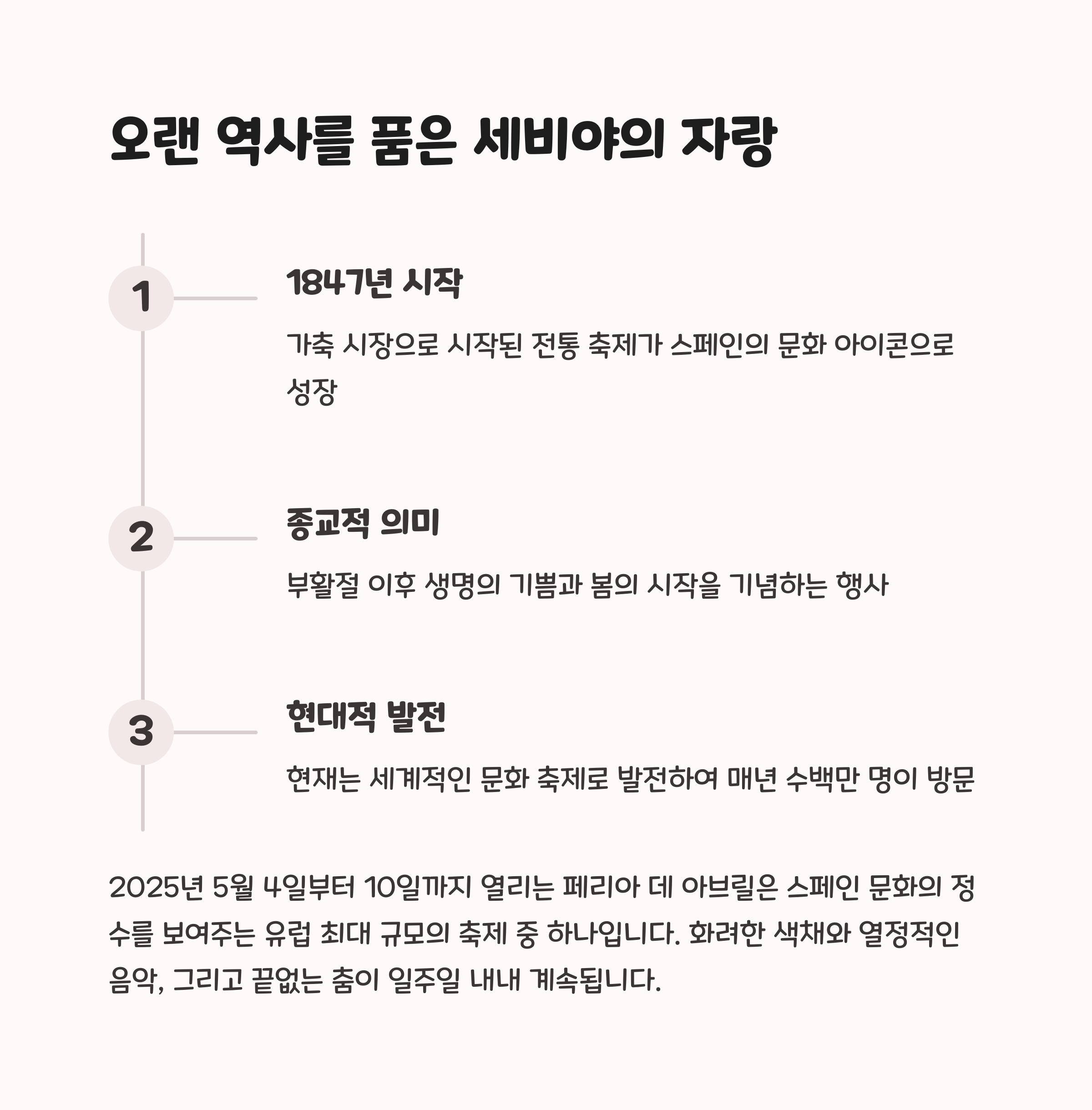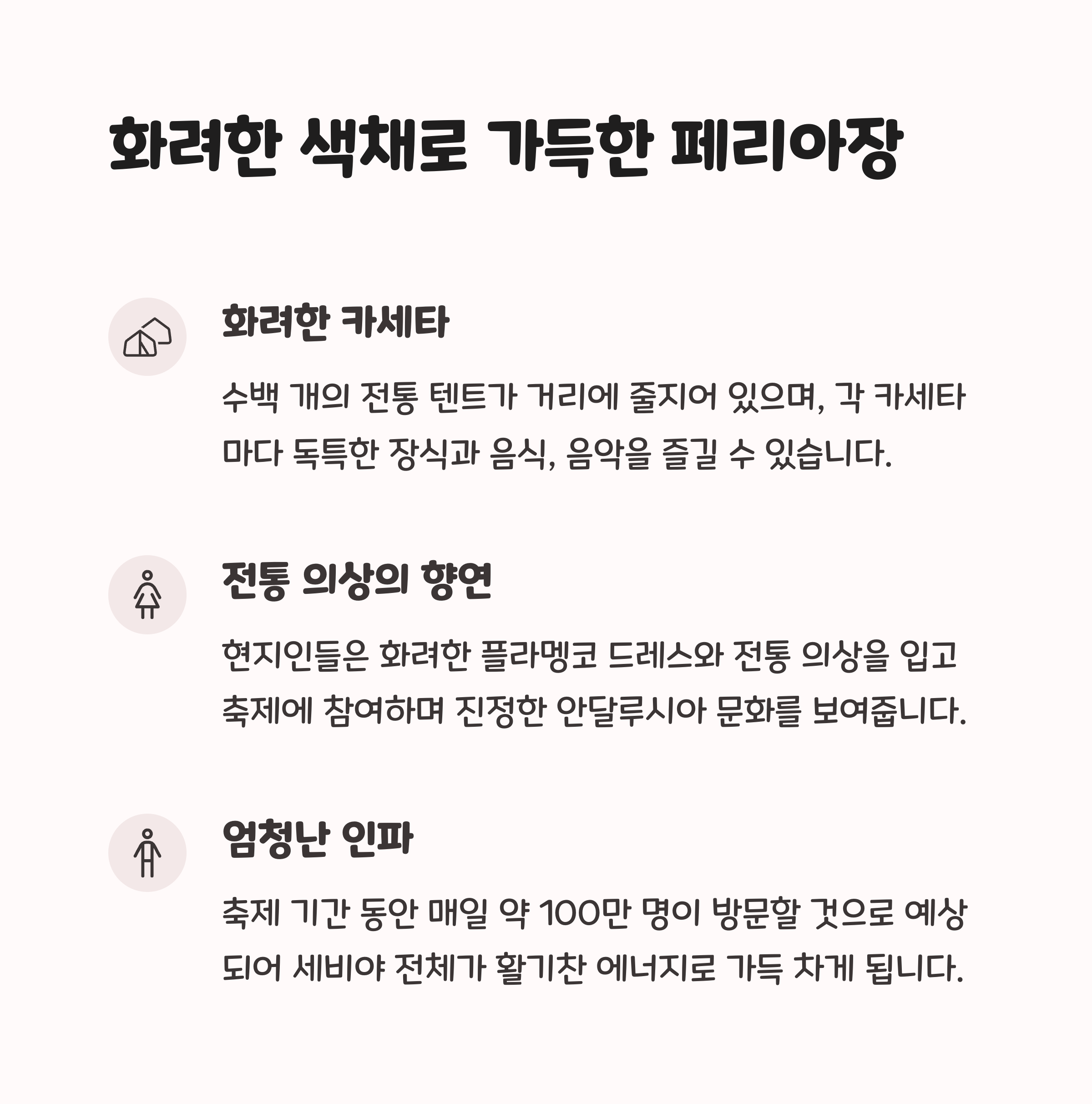 이 축제는 스페인 문화의 정수를 경험할 수 있는 특별한 기회입니다.