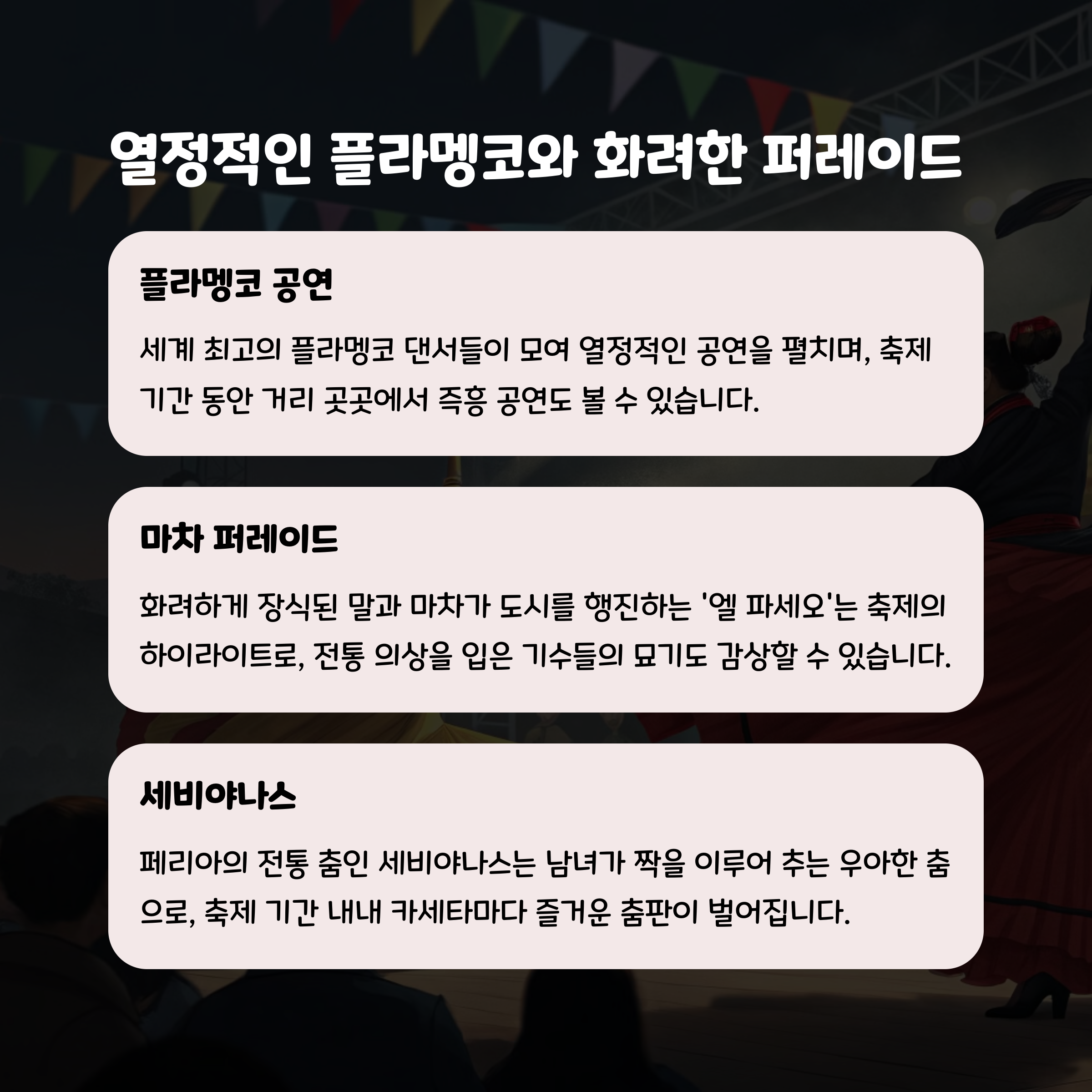 특히 플라멩코는 축제의 중심으로 열정적인 춤과 음악이 페리아장을 가득 채웁니다.