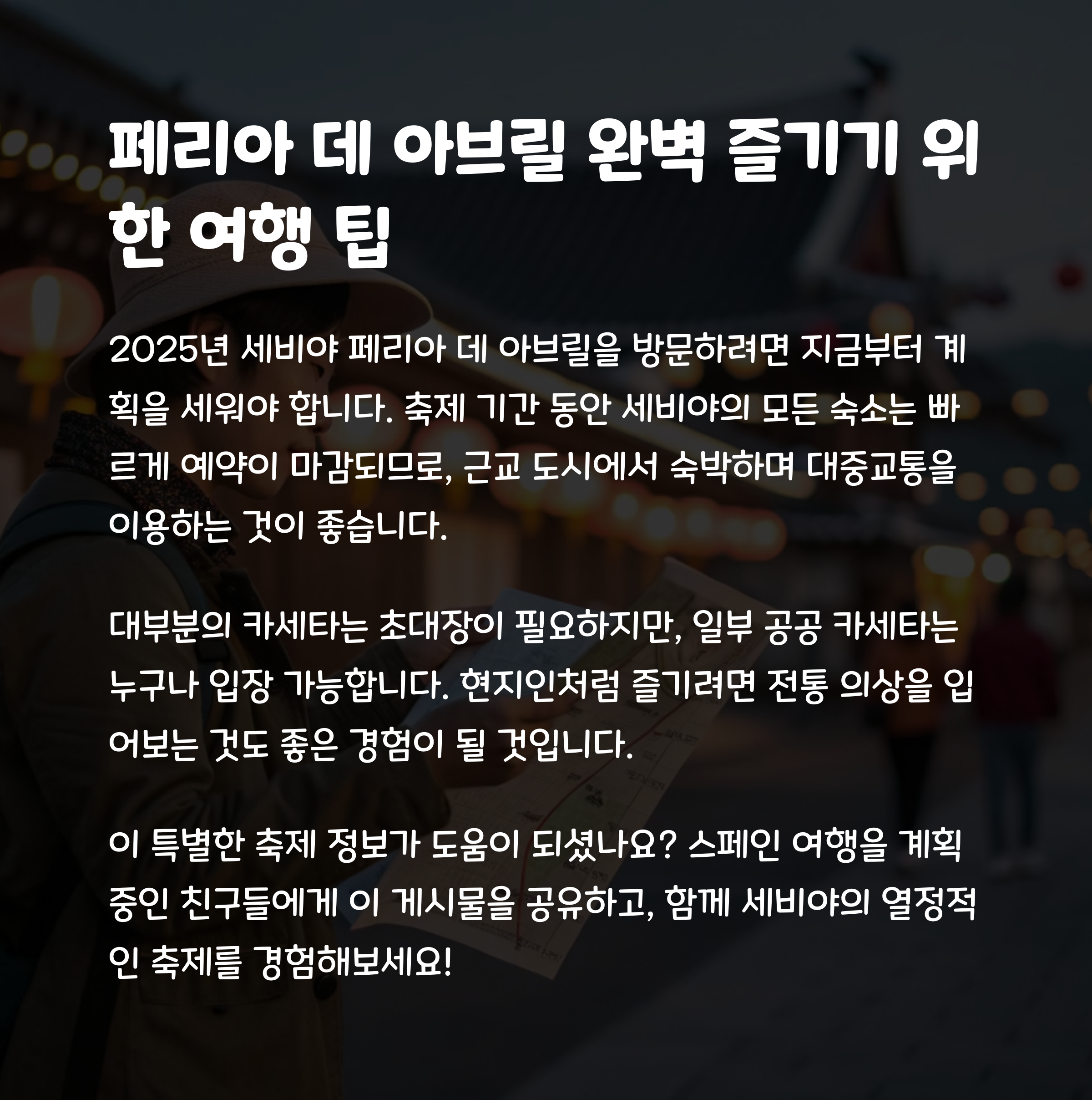 | Q. 페리아 데 아브릴을 방문할 때 어떤 복장을 준비해야 하나요? |