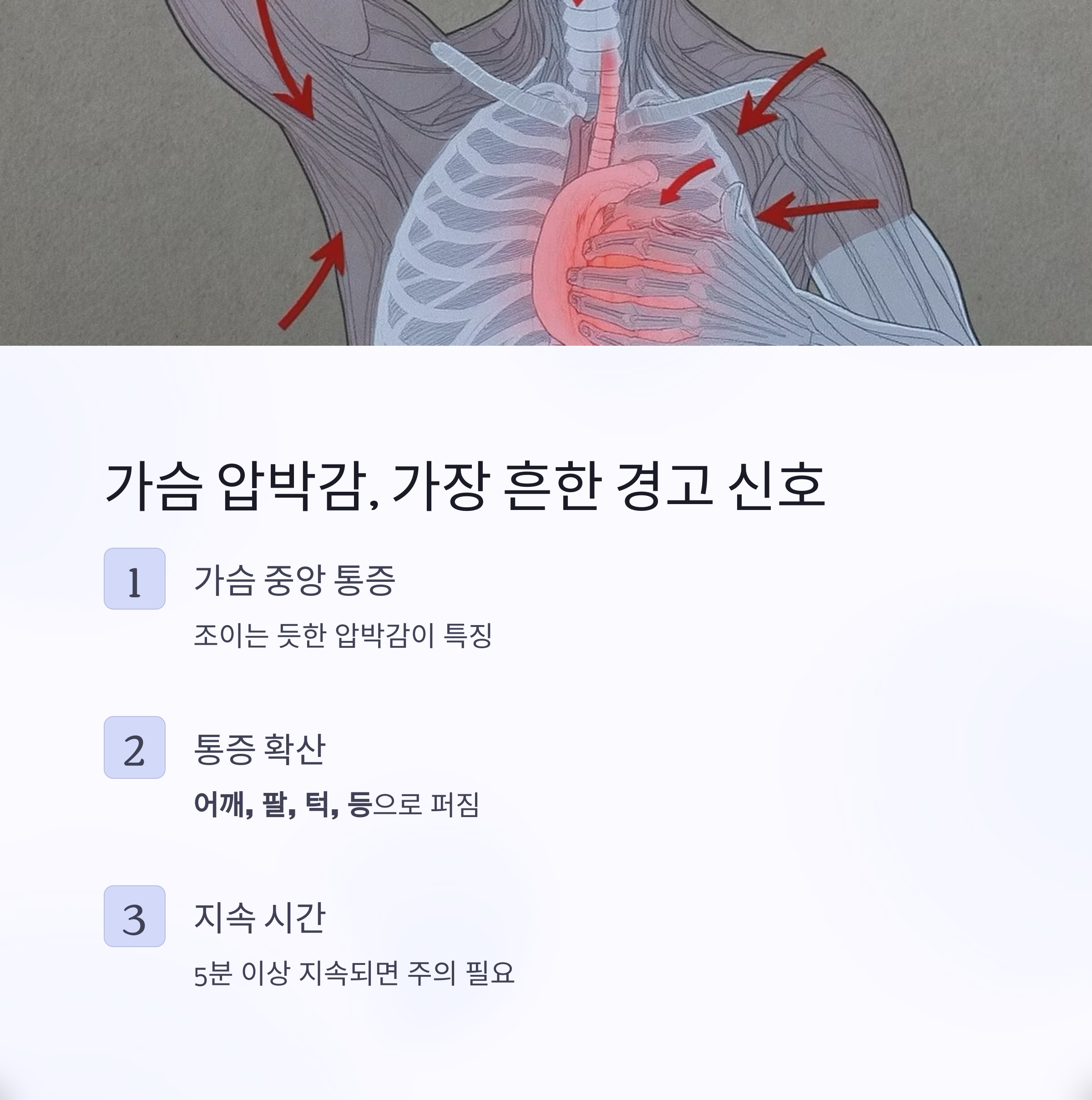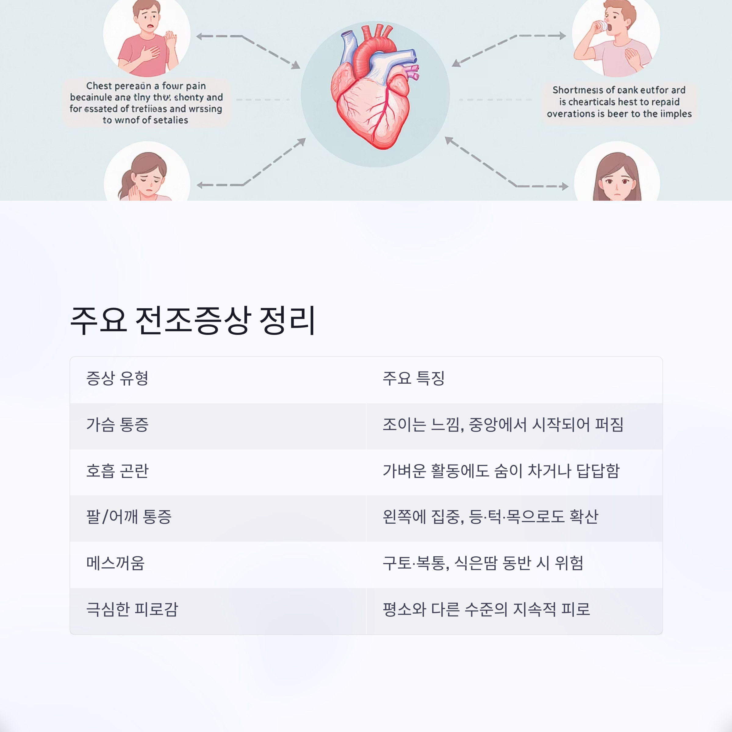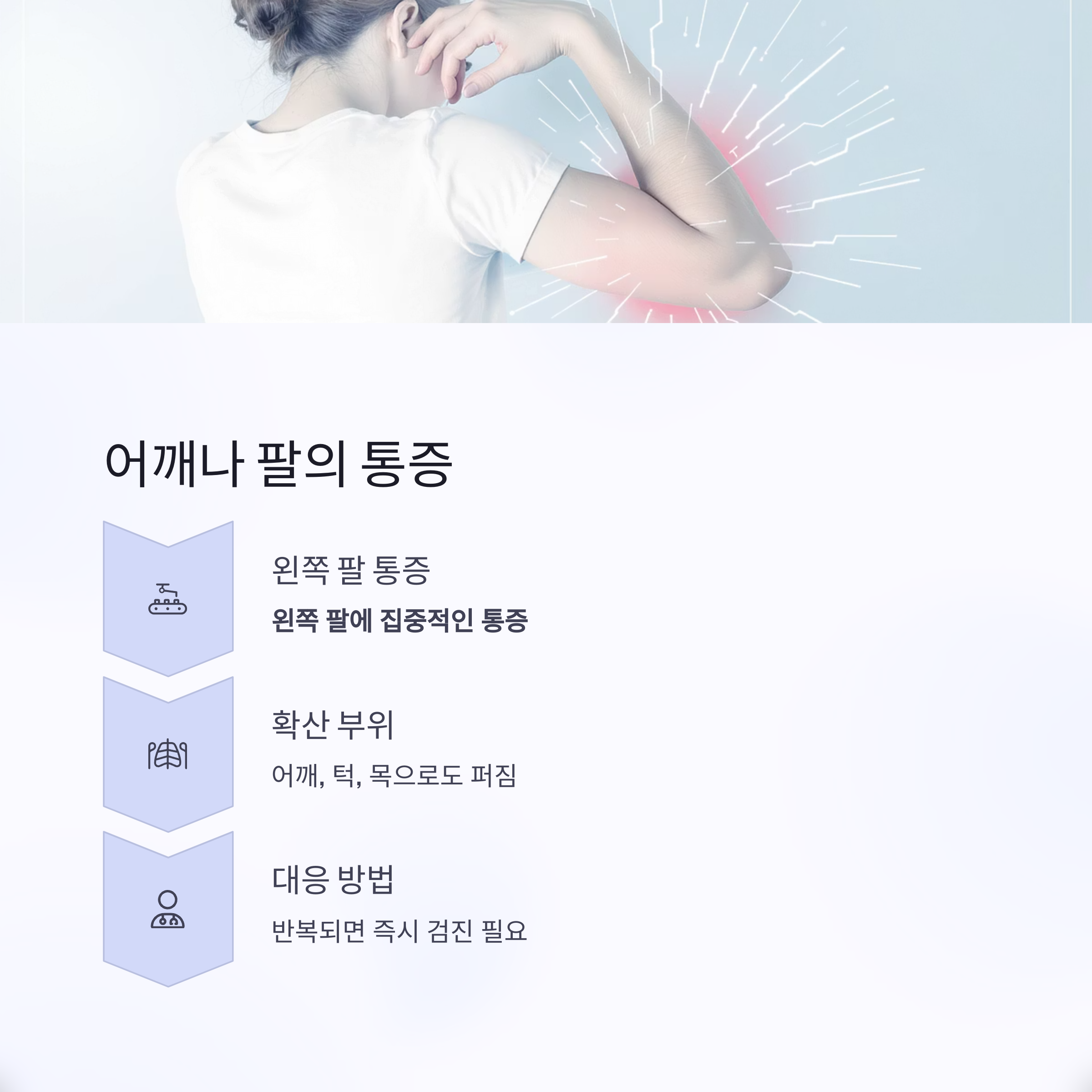 | 팔/어깨 통증 | 왼쪽에 집중, 등·턱·목으로도 확산 가능 |