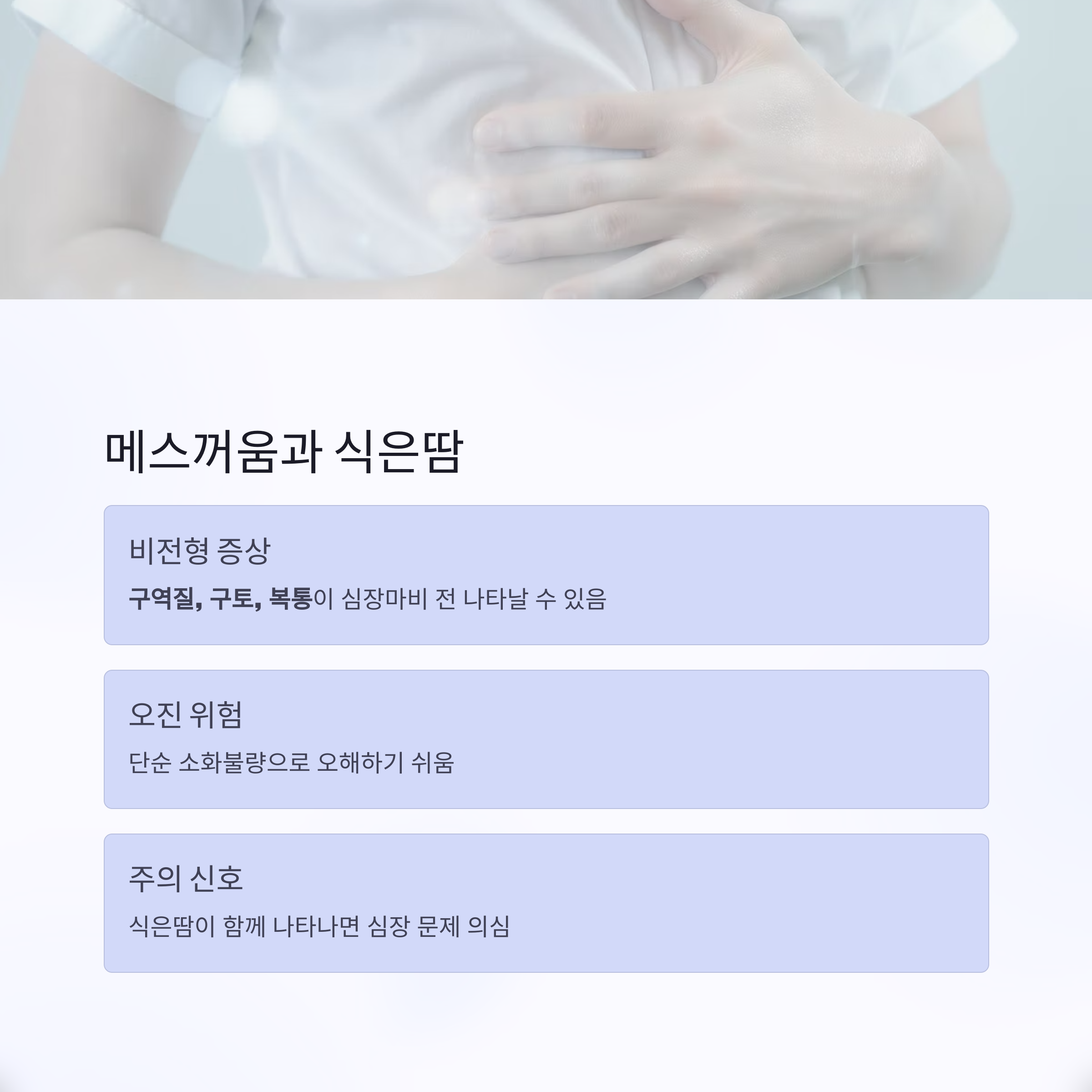 | 메스꺼움/소화불량 | 구토·복통, 식은땀 동반 시 더욱 위험 |