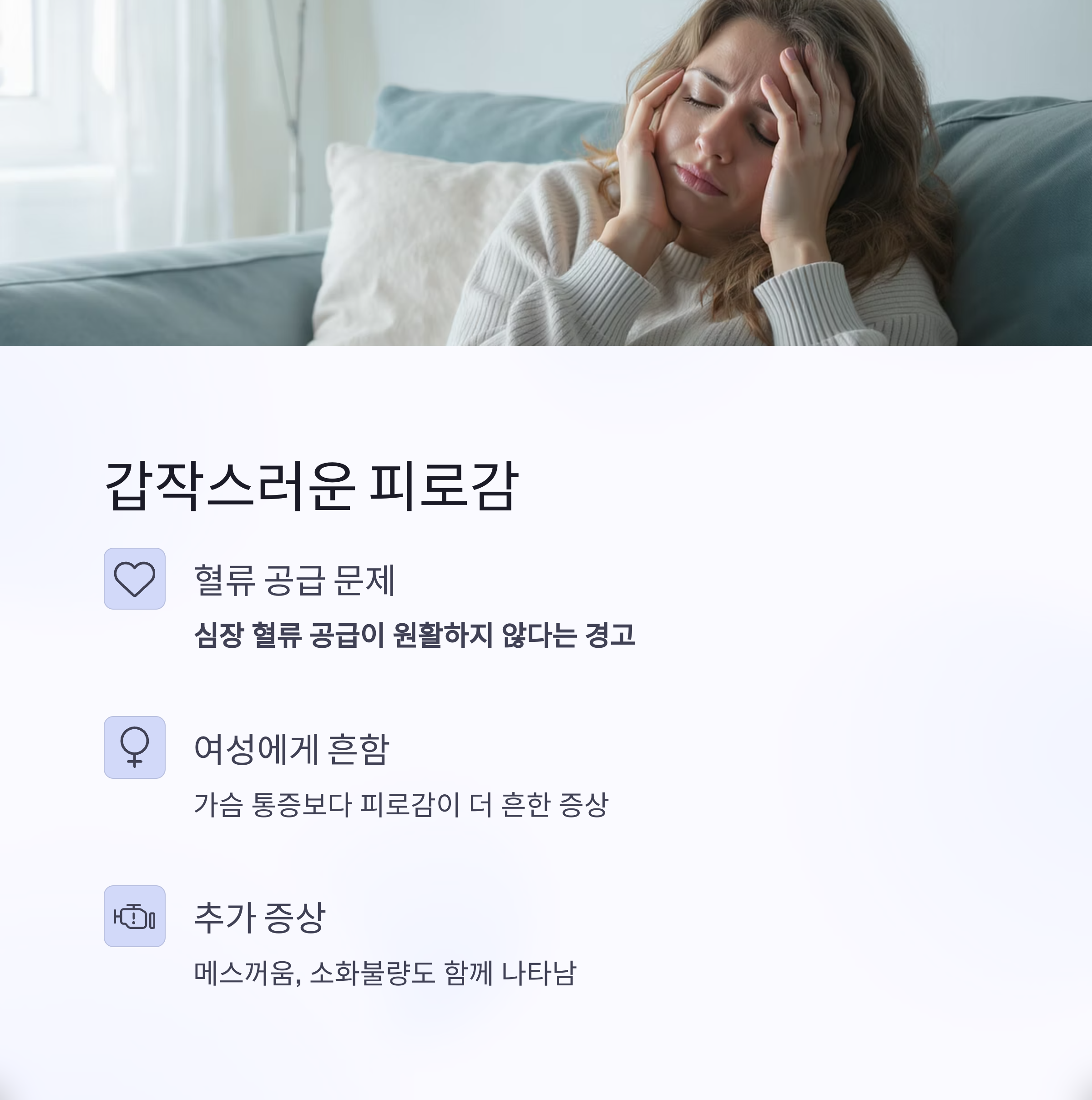 | 극심한 피로감 | 평소와 다른 수준의 지속적 피로, 특히 여성에게 흔함 |