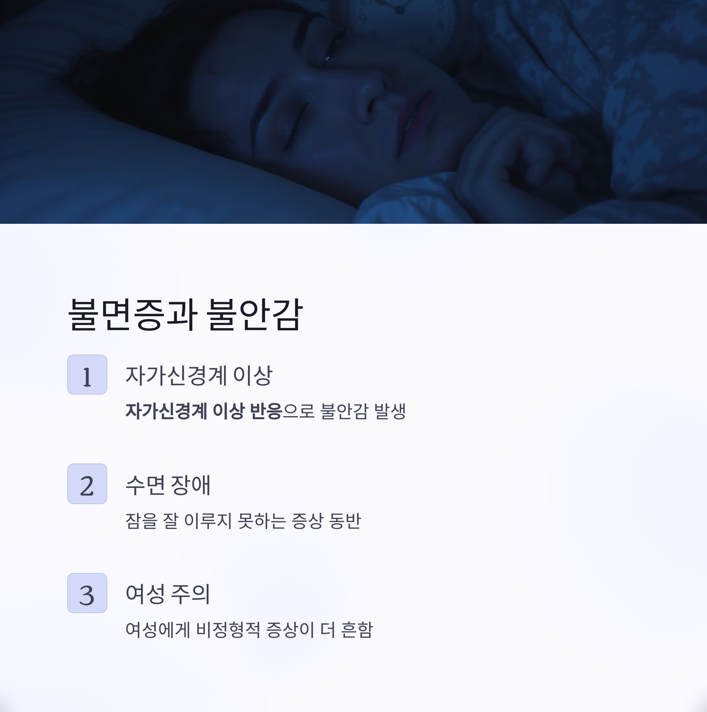 | 불안/불면 | 원인 없는 불안감, 잠이 안 오는 증상도 신호일 수 있음 |