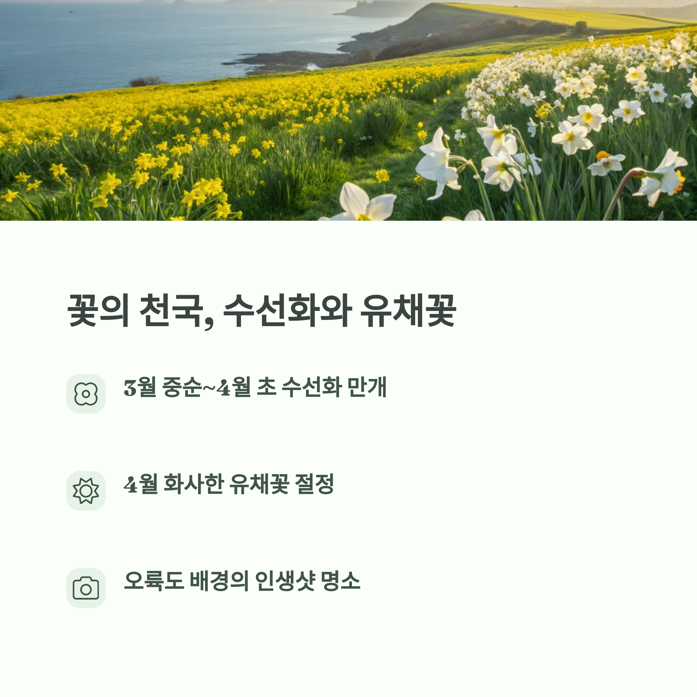 특히 봄철에는 수선화와 유채꽃이 가득 피어나면서 해안을 따라 아름다운 장관을 연출합니다.