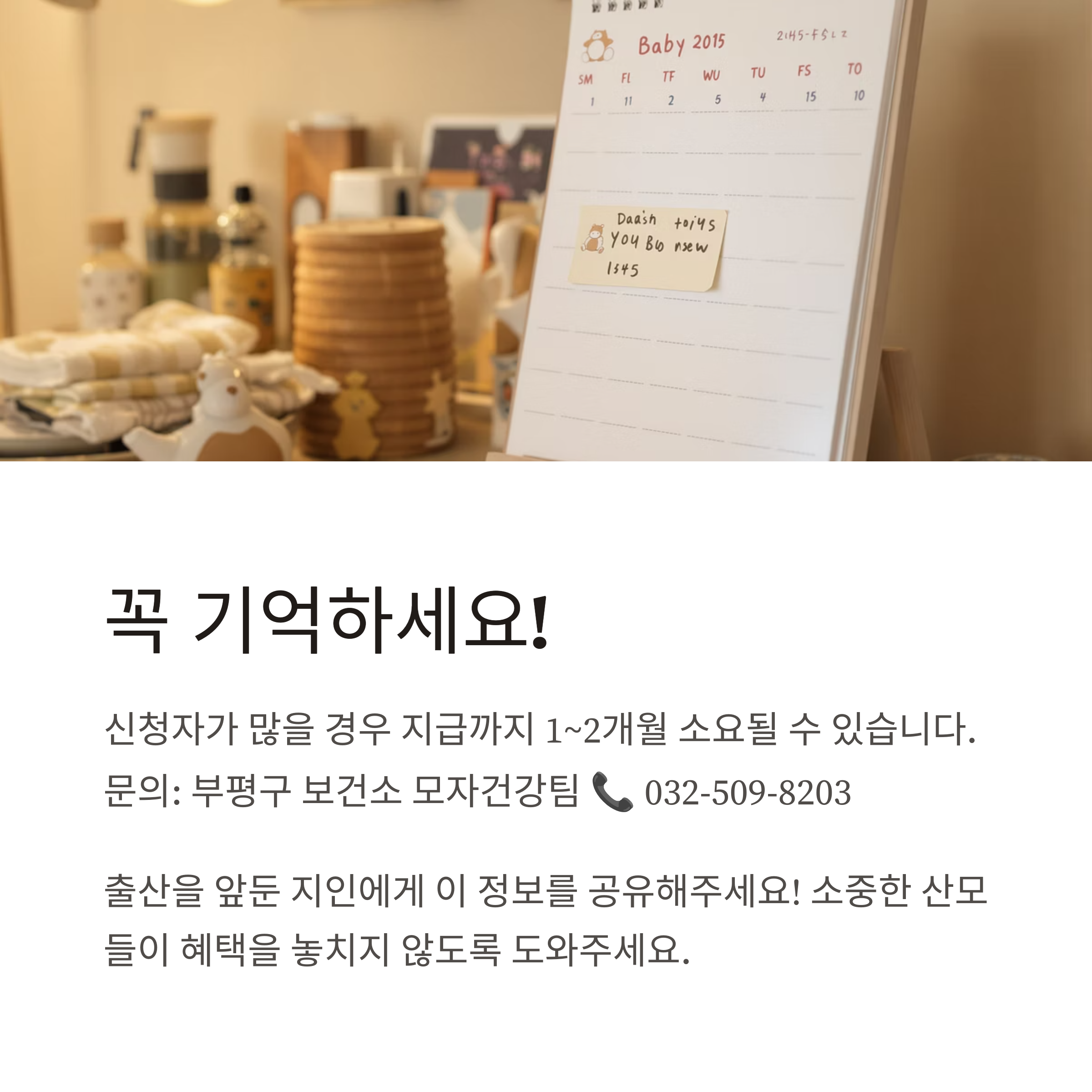 인천시 부평구 거주 산모라면, 최대 150만 원까지 산후조리비를 지원받을 수 있습니다.