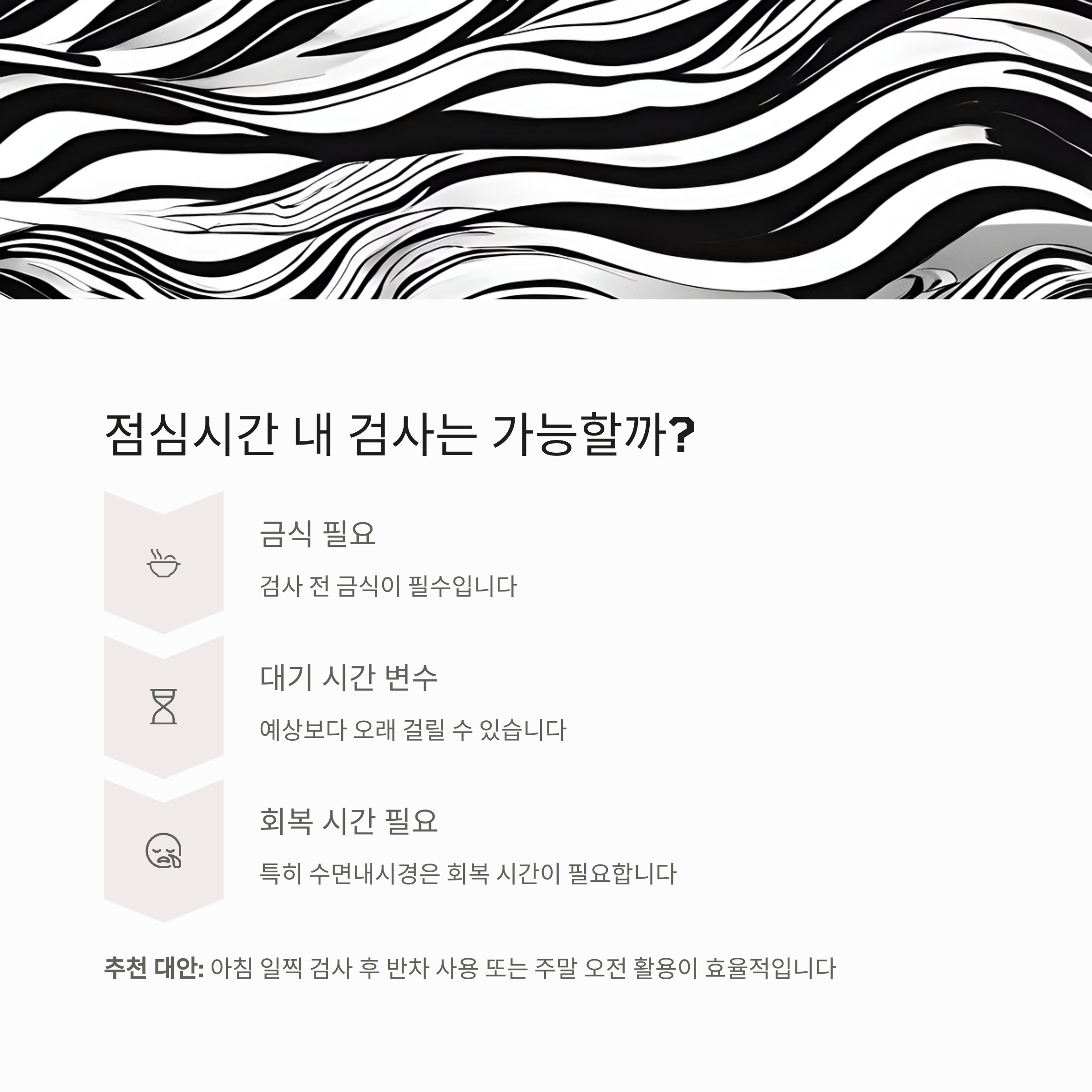 오전 8~9시 검사 예약이 가장 이상적이며, 전체 소요 시간은 약 3~4시간입니다.