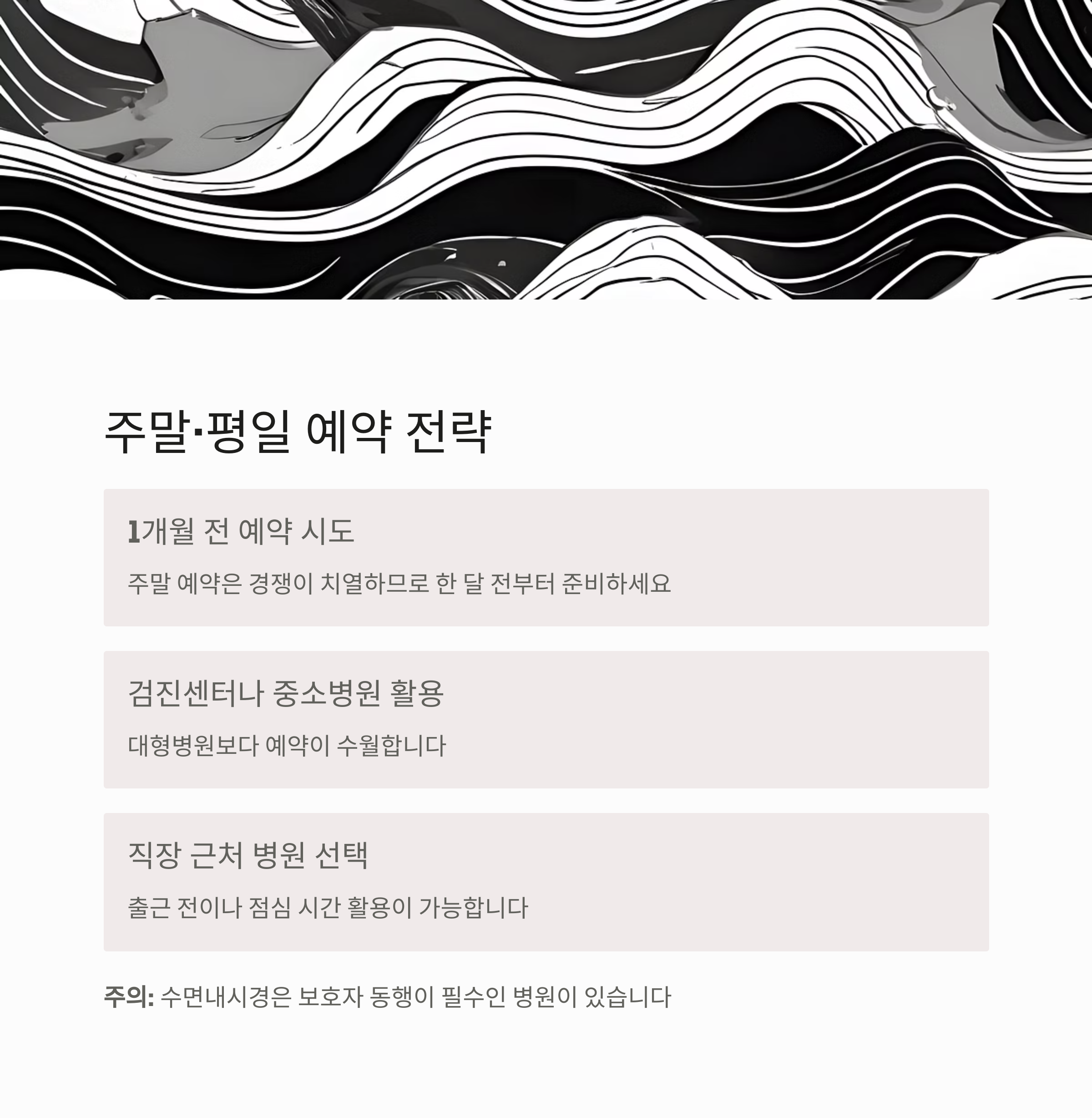 1개월 전 예약 시도가 가장 유리하며, 대형 병원보다는 검진센터나 중소병원이 예약이 수월합니다.