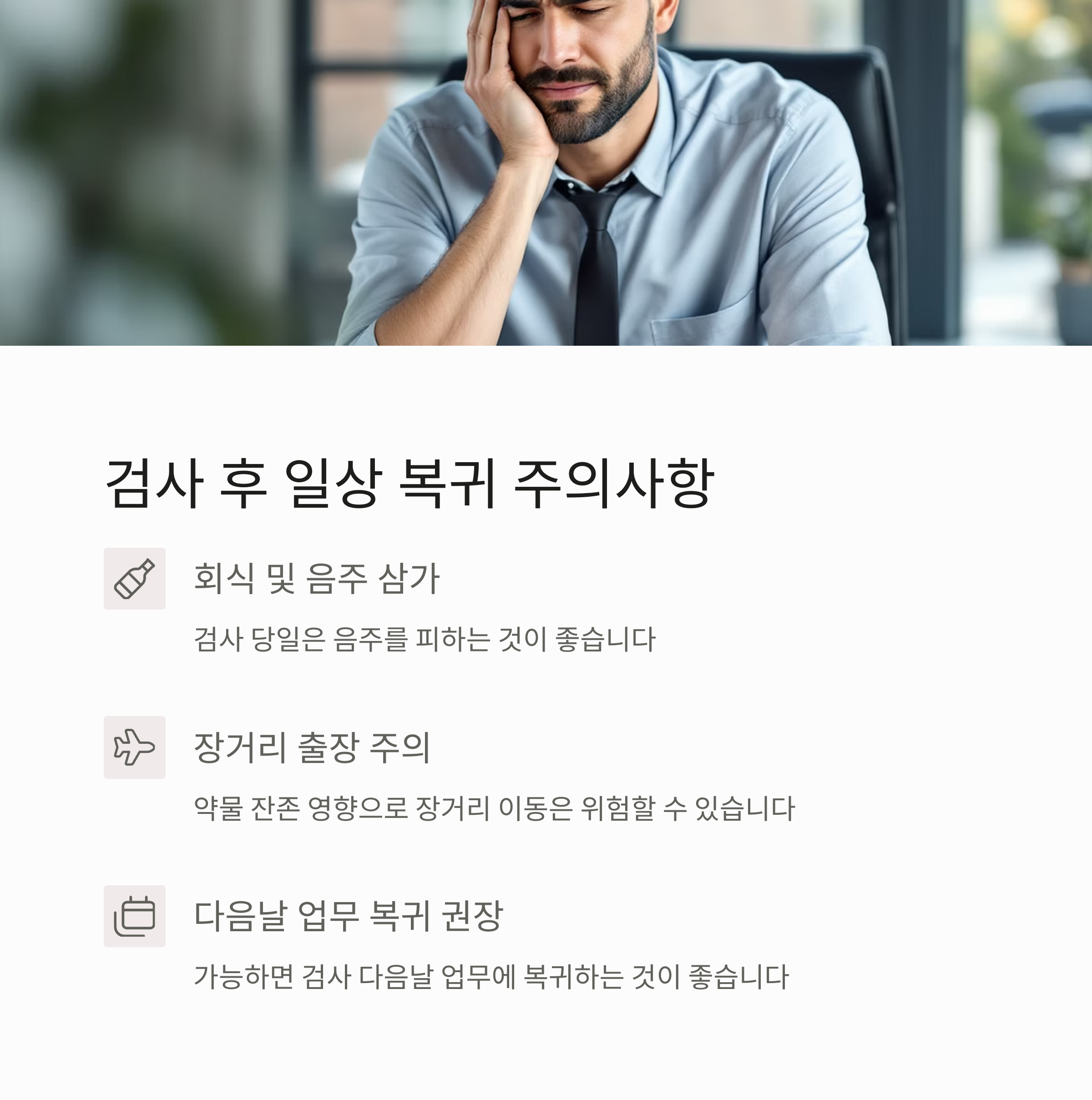 수면내시경은 프로포폴 등의 약물을 사용하므로, 당일에는 업무 집중이 어렵습니다.