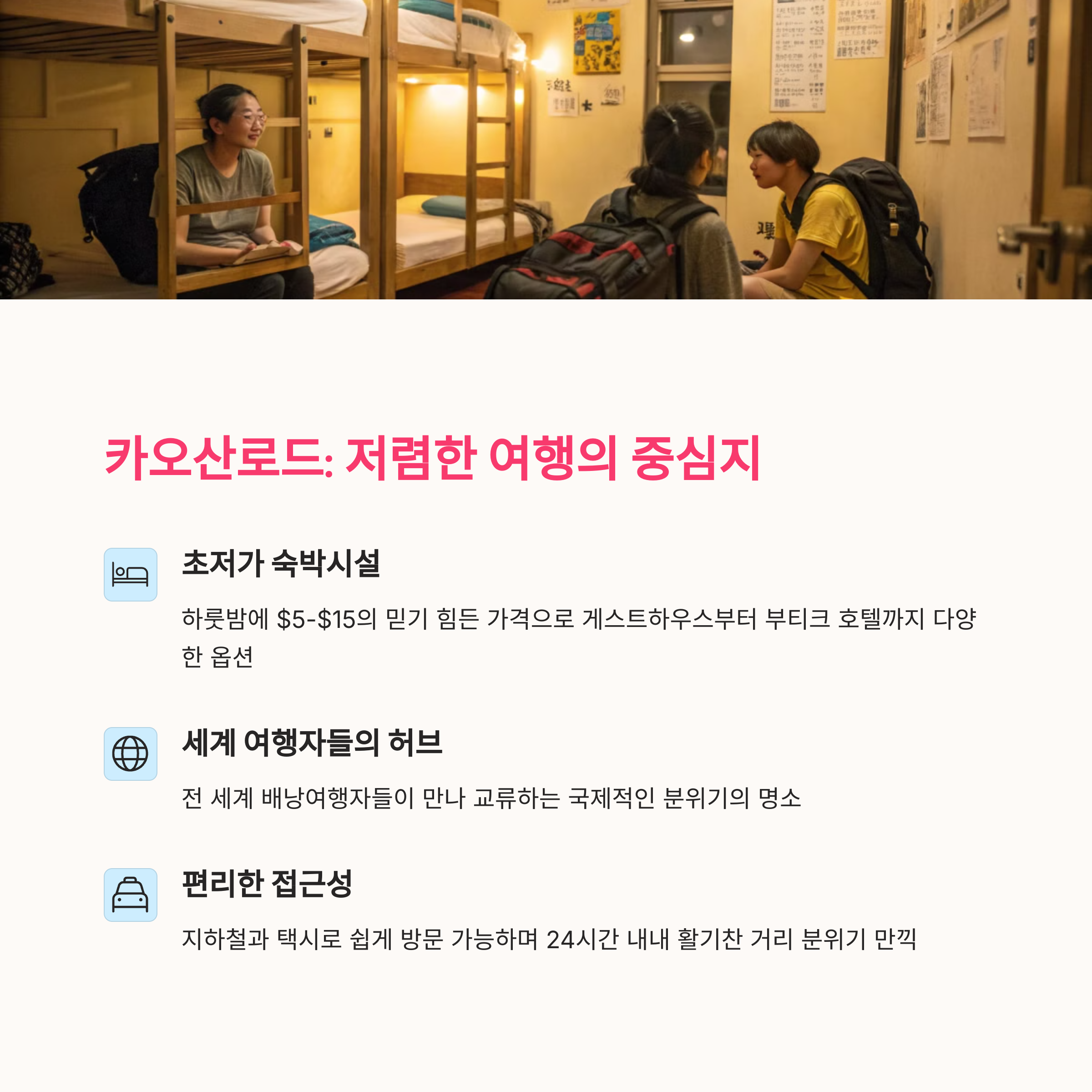 카오산로드는 저렴한 숙박 시설과 길거리 음식으로 인해 관광객들에게 매력적이며, 방콕 경제에 큰 기여를 하고 있습니다.