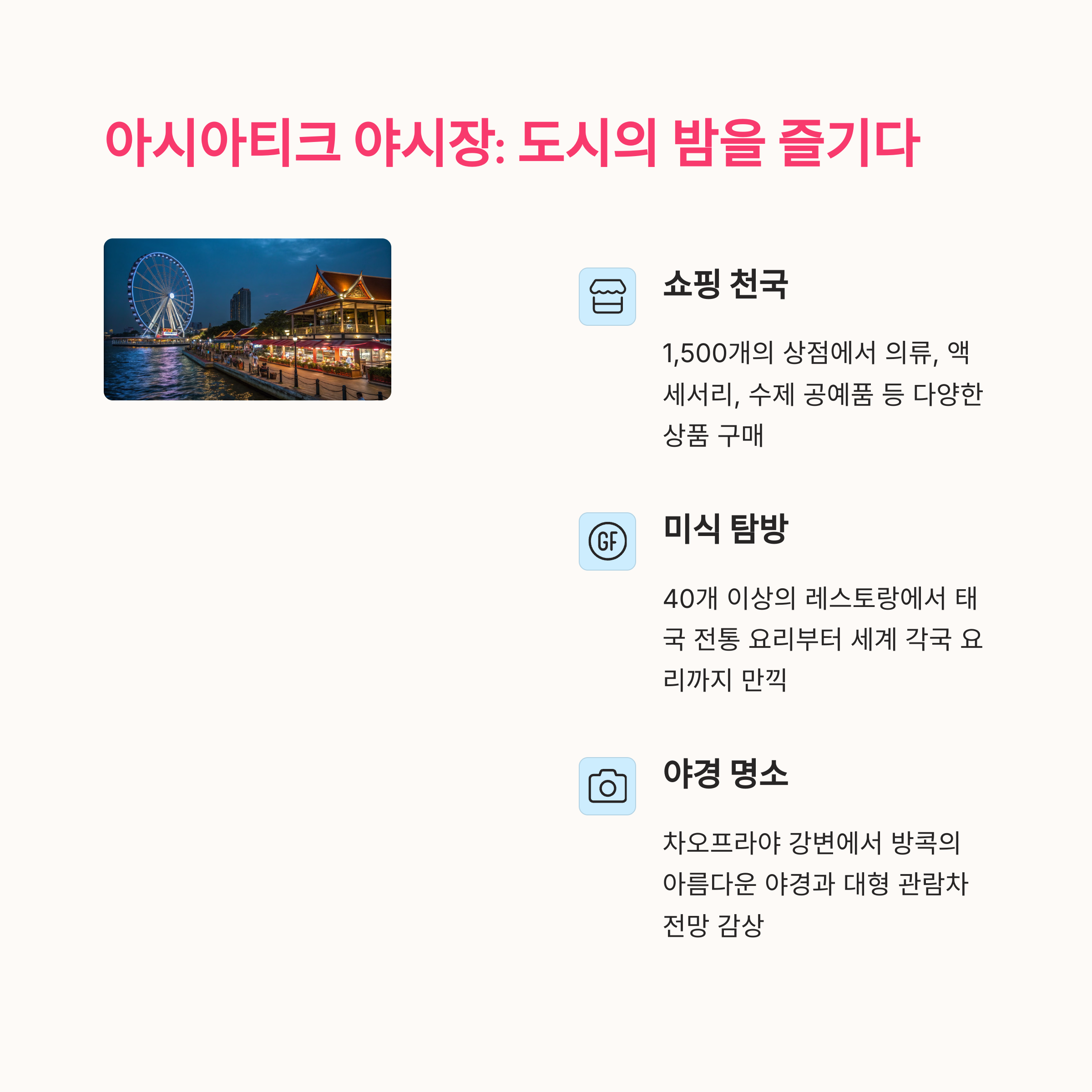 | 아시아티크 야시장 | 17:00~자정 | 강변 풍경 | 저녁 |