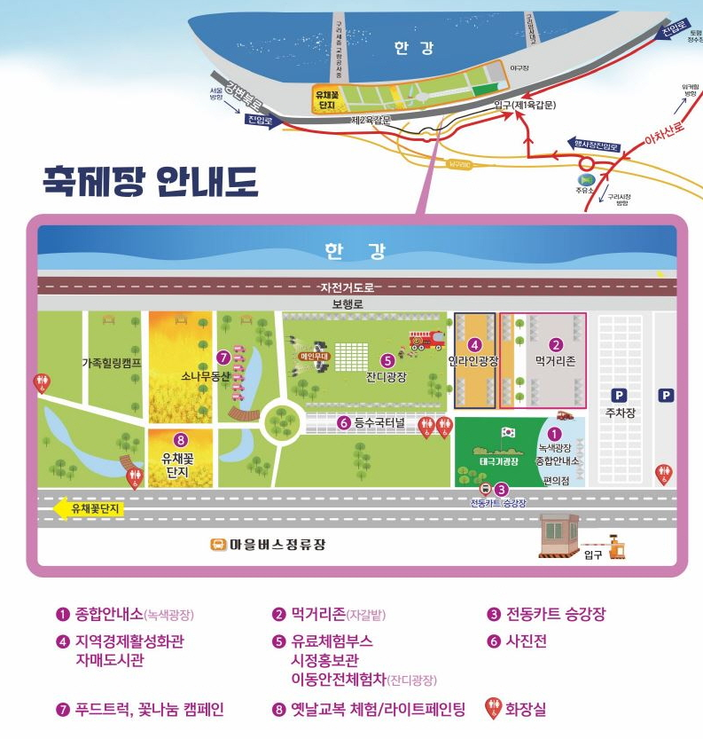 한강시민공원 유채꽃 단지 하차 - 축제기간 중 무료 셔틀버스 운행 예정, 구리역과 축제장 왕복