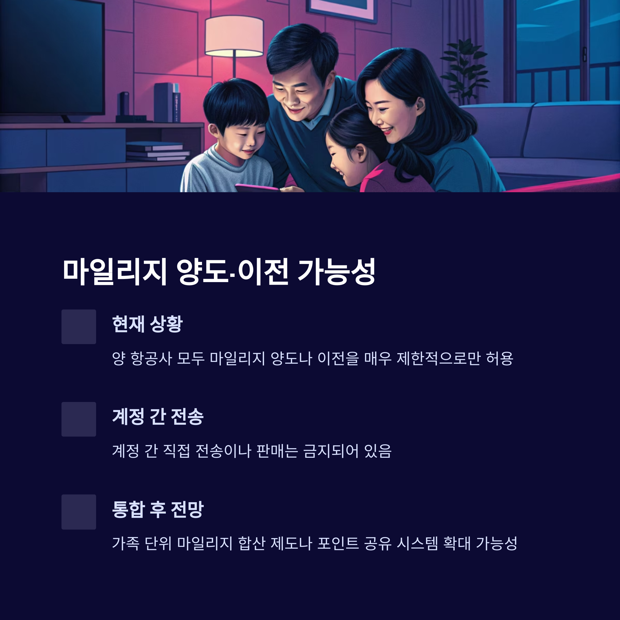 단, 통합 이후에는 가족 단위 마일리지 합산 제도나 포인트 공유 시스템이 확대될 가능성이 있습니다. 대한항공 측은 내부 검토 중임을 밝히고 있으며, 아시아나 회원들의 불이익을 방지하기 위해 가족 마일리지 통합 기능은 우선 제공될 가능성이 있습니다.