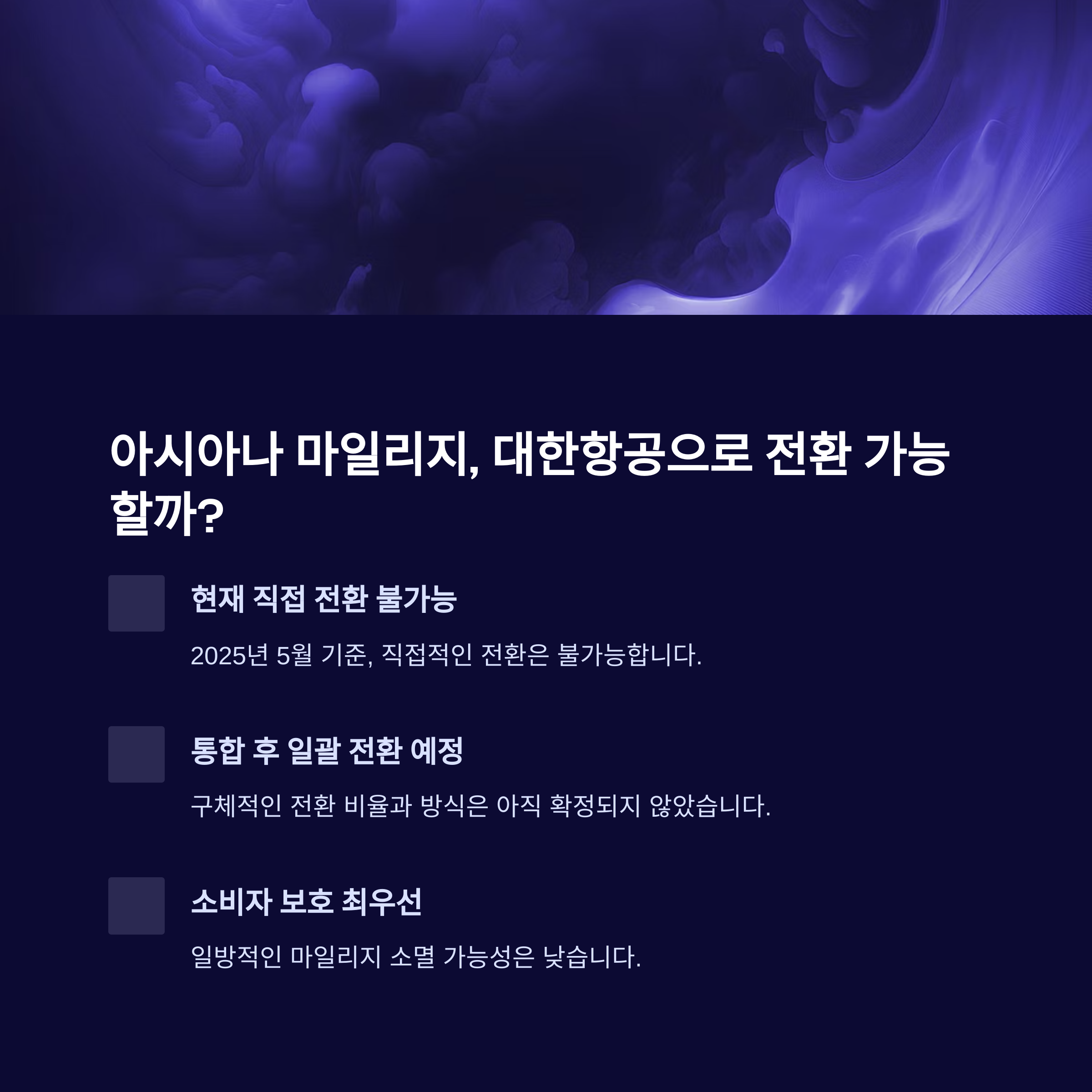 다만, 구체적인 전환 비율과 방식은 아직 확정되지 않았으며, 공정위 심사 조건에 따라 조정될 가능성이 큽니다. 국토교통부 및 공정위는 소비자 불이익 방지를 최우선 과제로 언급하고 있으므로 일방적인 마일리지 소멸 가능성은 낮은 상황입니다.