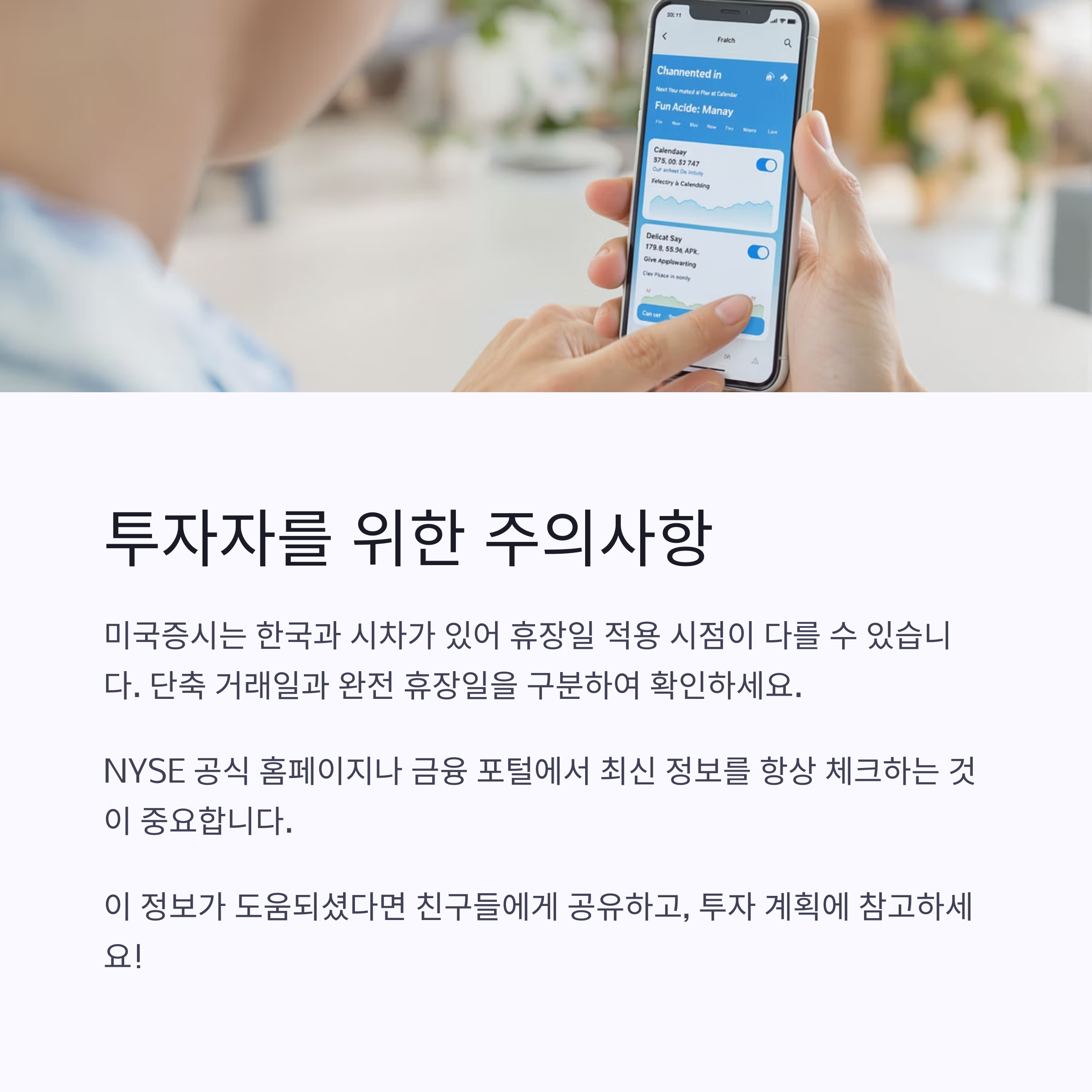또, 미국 증시는 한국과 시차가 있어 휴장일 적용 시점이 한국 시간과 다를 수 있으므로 주의가 필요합니다.