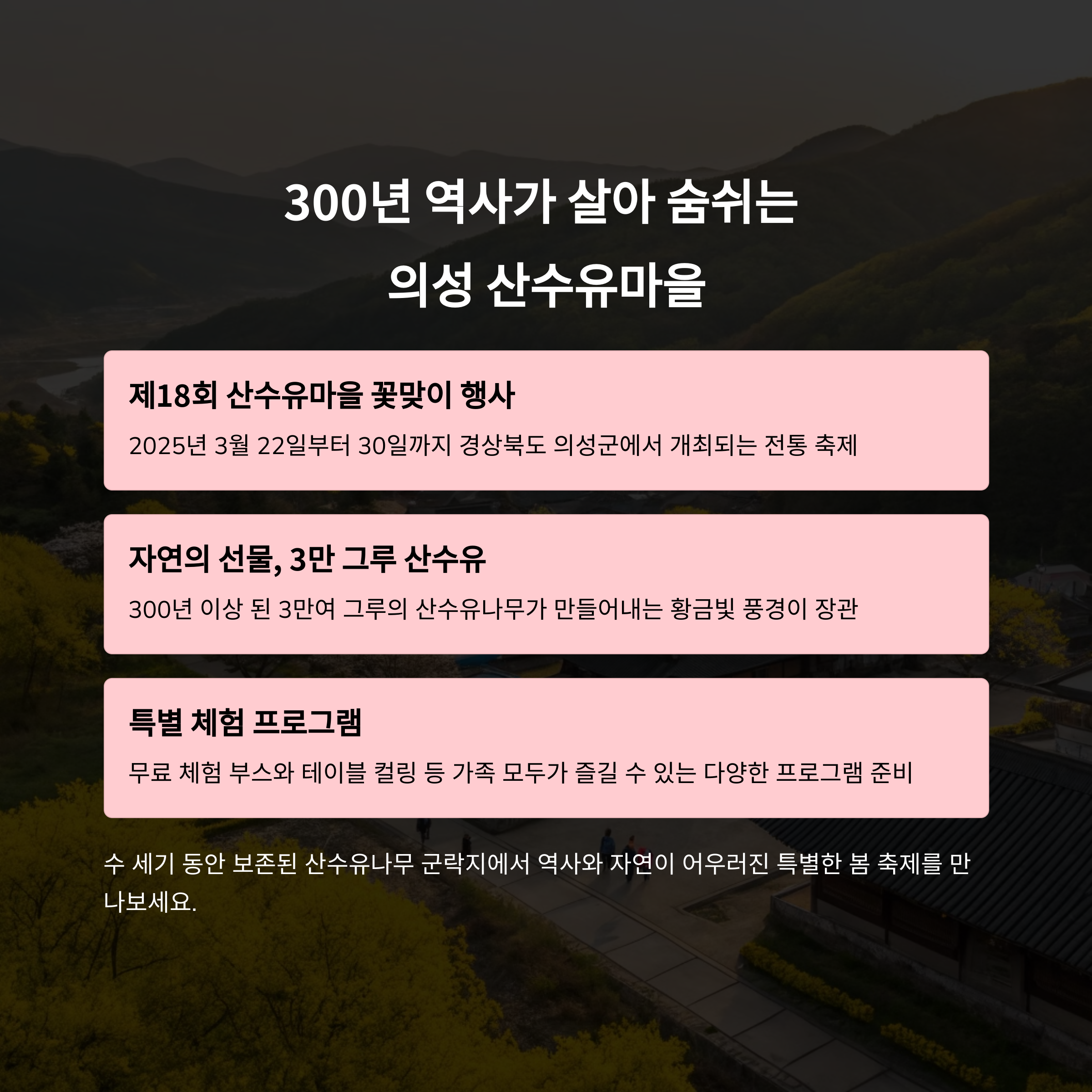 오늘은 다가오는 2025 산수유 축제 일정 및 의성 봄꽃 여행지에 대해 함께 알아보겠습니다.
