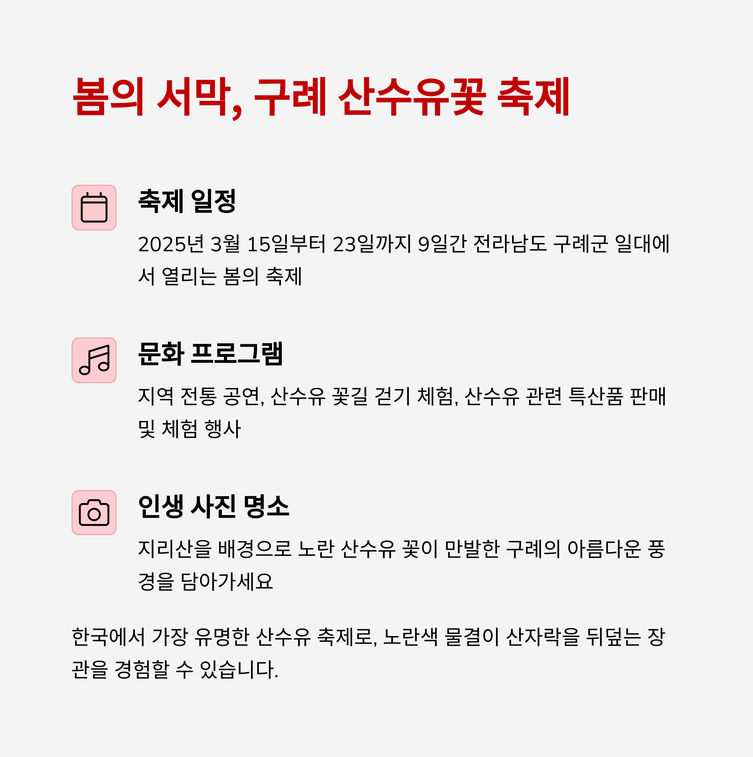 | 구례 산수유꽃 축제 일정 | 2025.3.15 ~ 2025.3.23 |