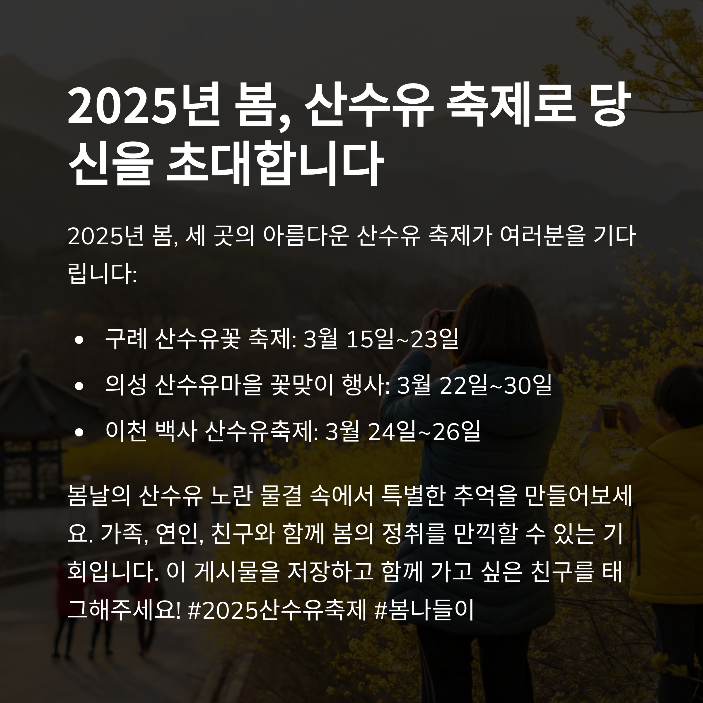 2025년 산수유 축제는 한국의 봄을 만끽할 수 있는 대표적인 행사로 자리 잡고 있습니다.
