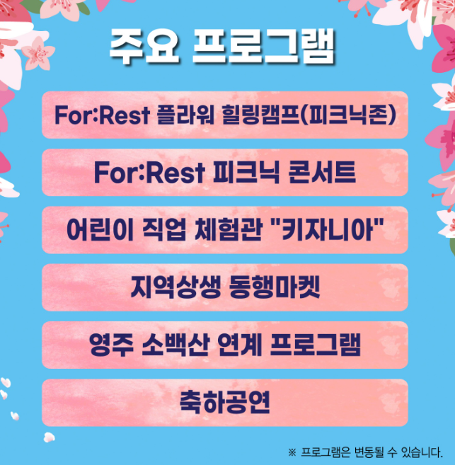 | 서천둔치(영주교 일대) | 개막식, 공연, 체험 부스, 지역 특산물 판매 |