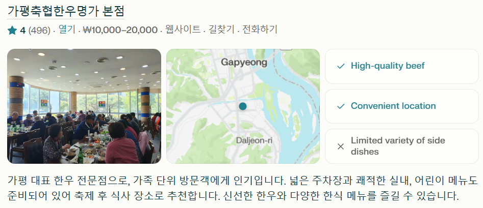 | 가평축협한우명가 | 신선한 한우, 가족 방문 적합 | ₩10,000–20,000 |