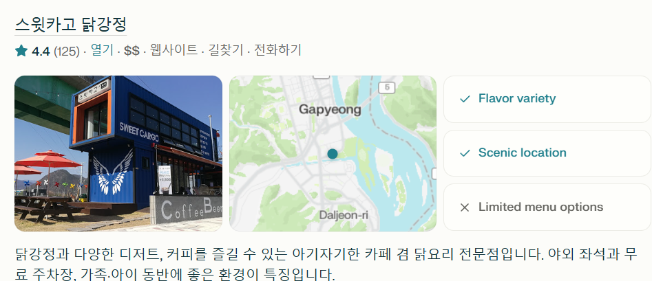 | 스윗카고 닭강정 | 디저트·닭강정 겸용 카페 | ₩10,000 전후 |