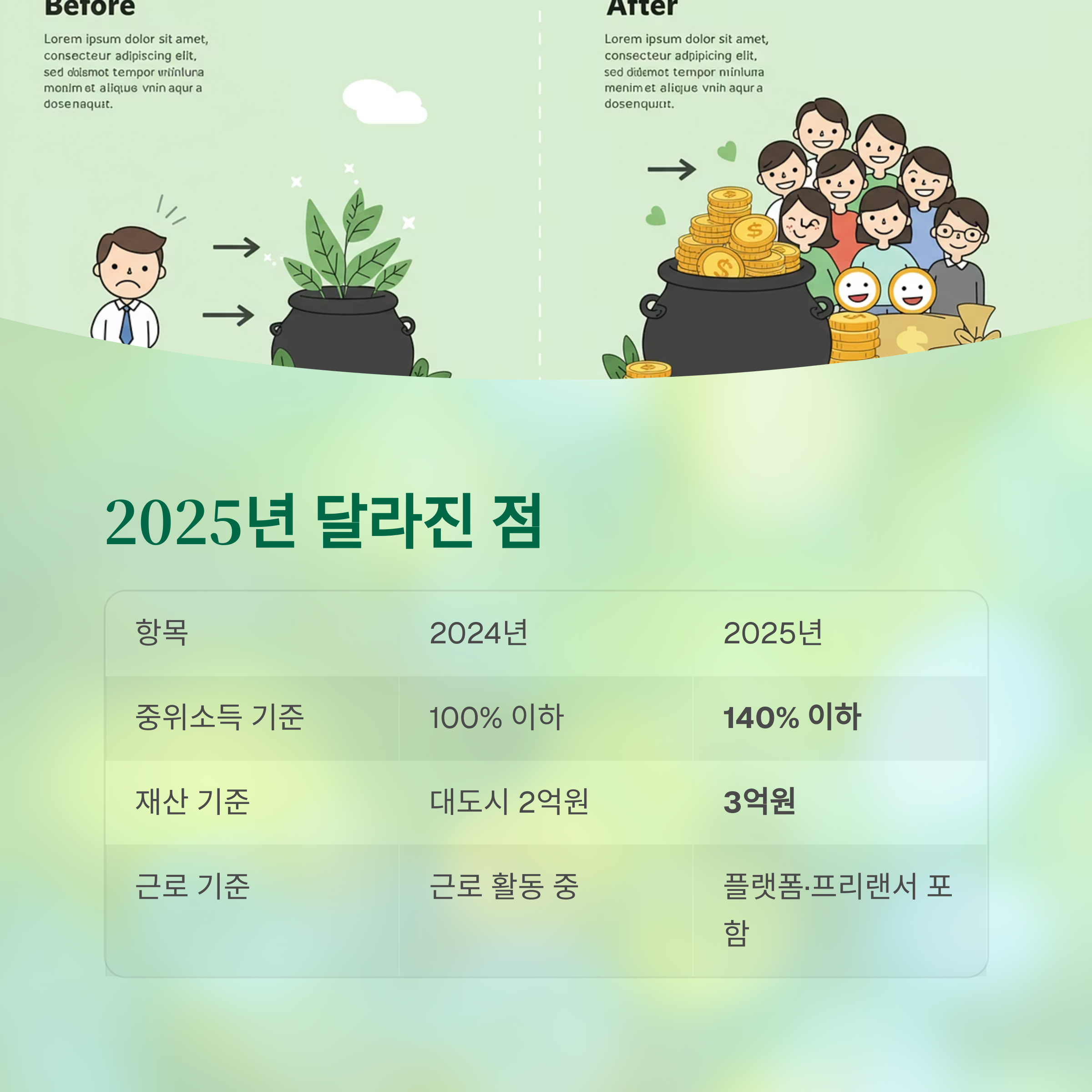 중위소득 기준이 140% 이하로 확대되면서 더 많은 청년이 혜택을 받을 수 있게 된 것이 핵심 변화입니다.