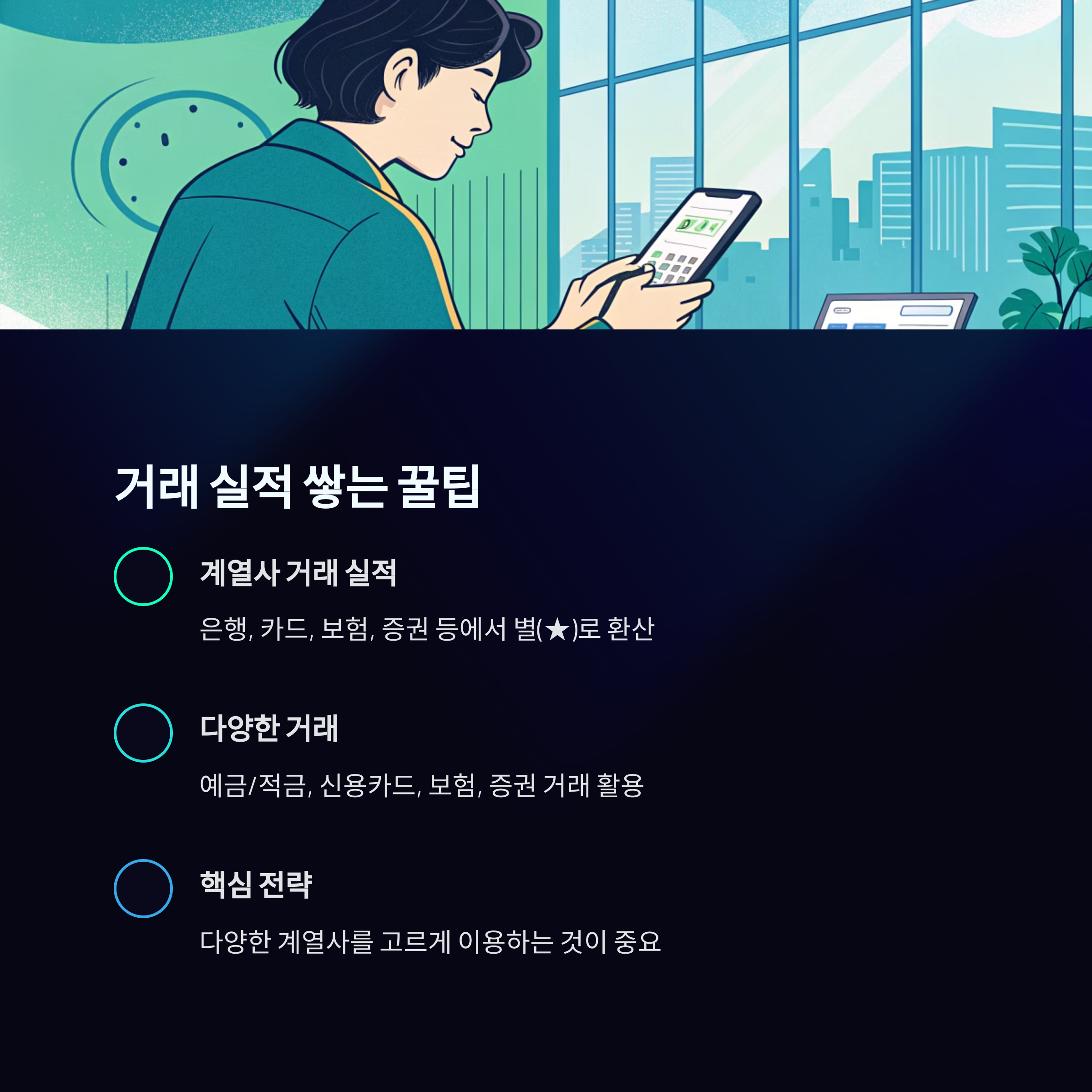 실적 평점은 은행, 카드, 보험, 증권, 캐피탈, 저축은행 등에서 누적되는 별(★)로 환산되며, 각 계열사마다 점수 기준이 다릅니다.