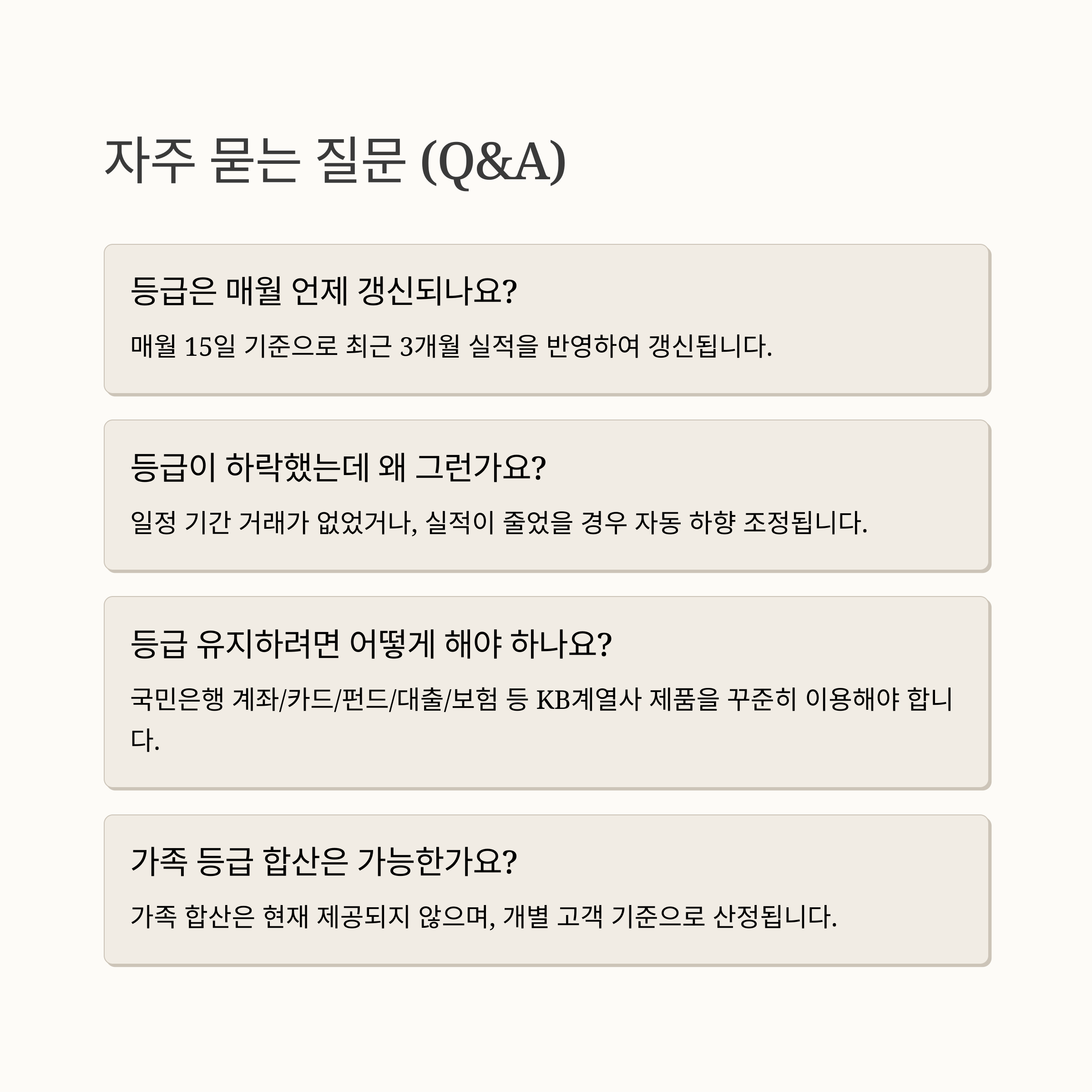 A. 국민은행 계좌/카드/펀드/대출/보험 등 KB계열사 제품을 꾸준히 이용해야 합니다.