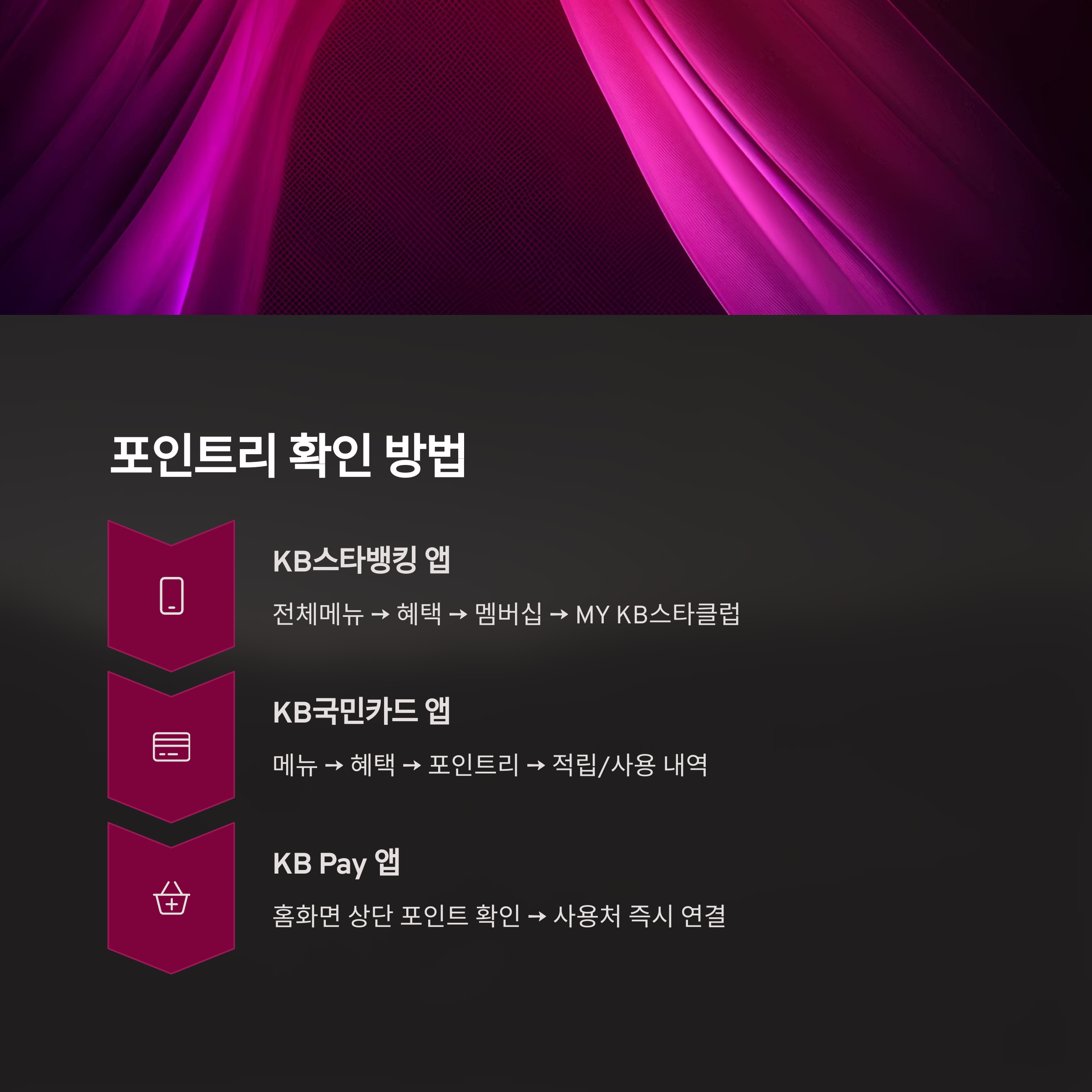 - KB Pay 앱: 홈화면 상단 포인트 확인 → 사용처 즉시 연결