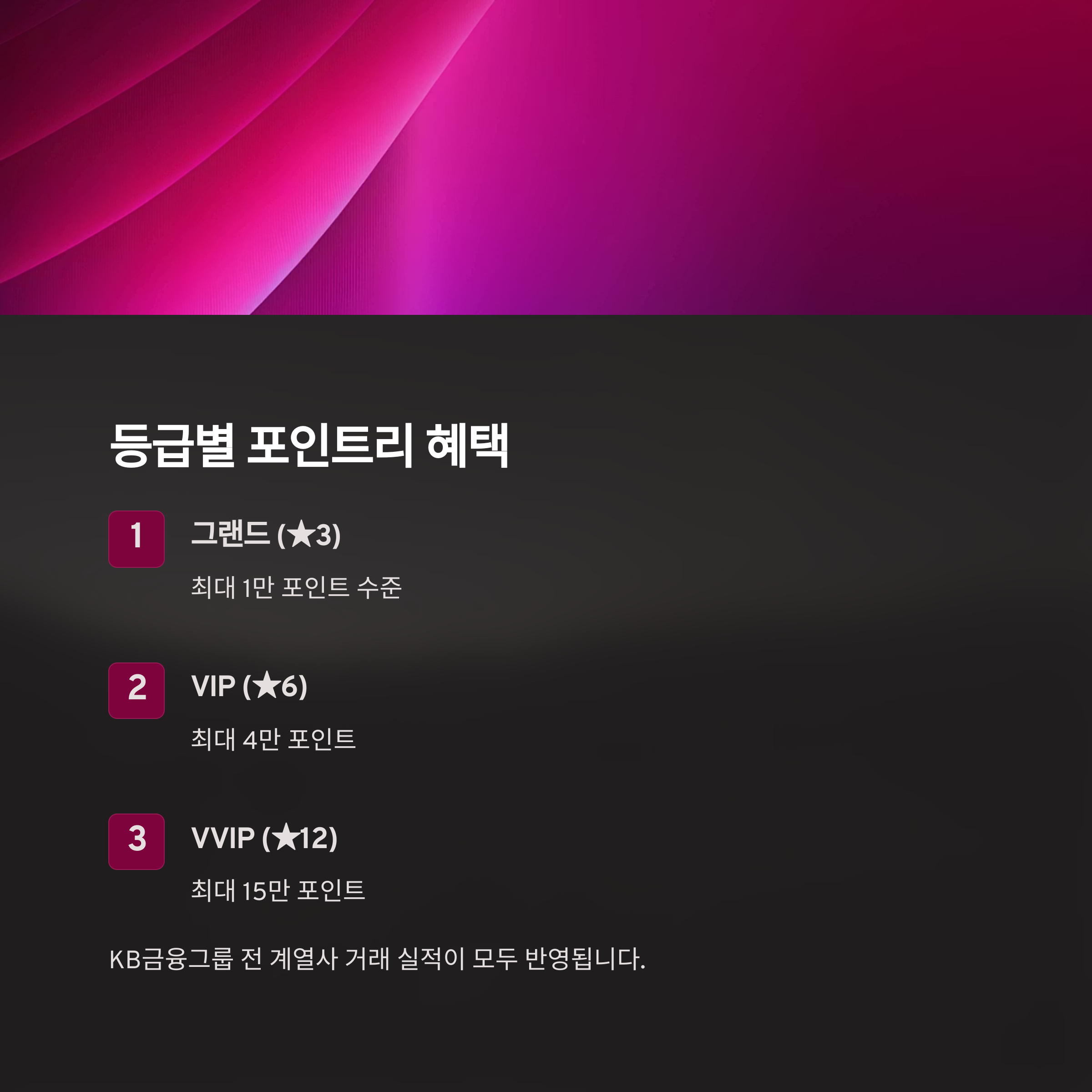 중요 포인트: 등급은 국민은행뿐 아니라 KB증권, KB손해보험, KB국민카드 등 그룹 전 계열사의 거래 실적이 모두 반영됩니다.