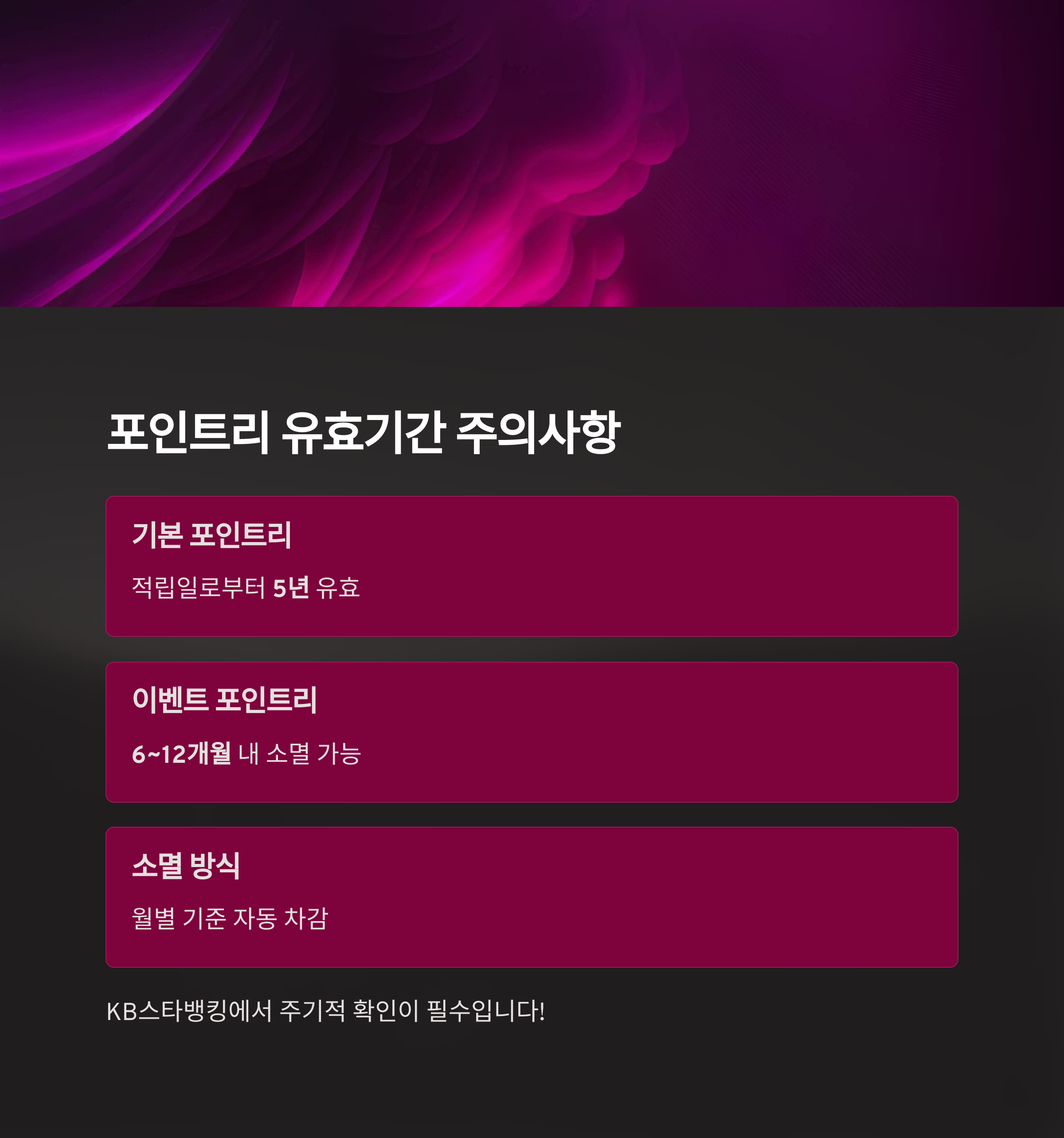 중요: 유효기간 도래 시 사전 안내 없이 자동 소멸되므로, KB스타뱅킹에서 주기적 확인이 필수입니다.