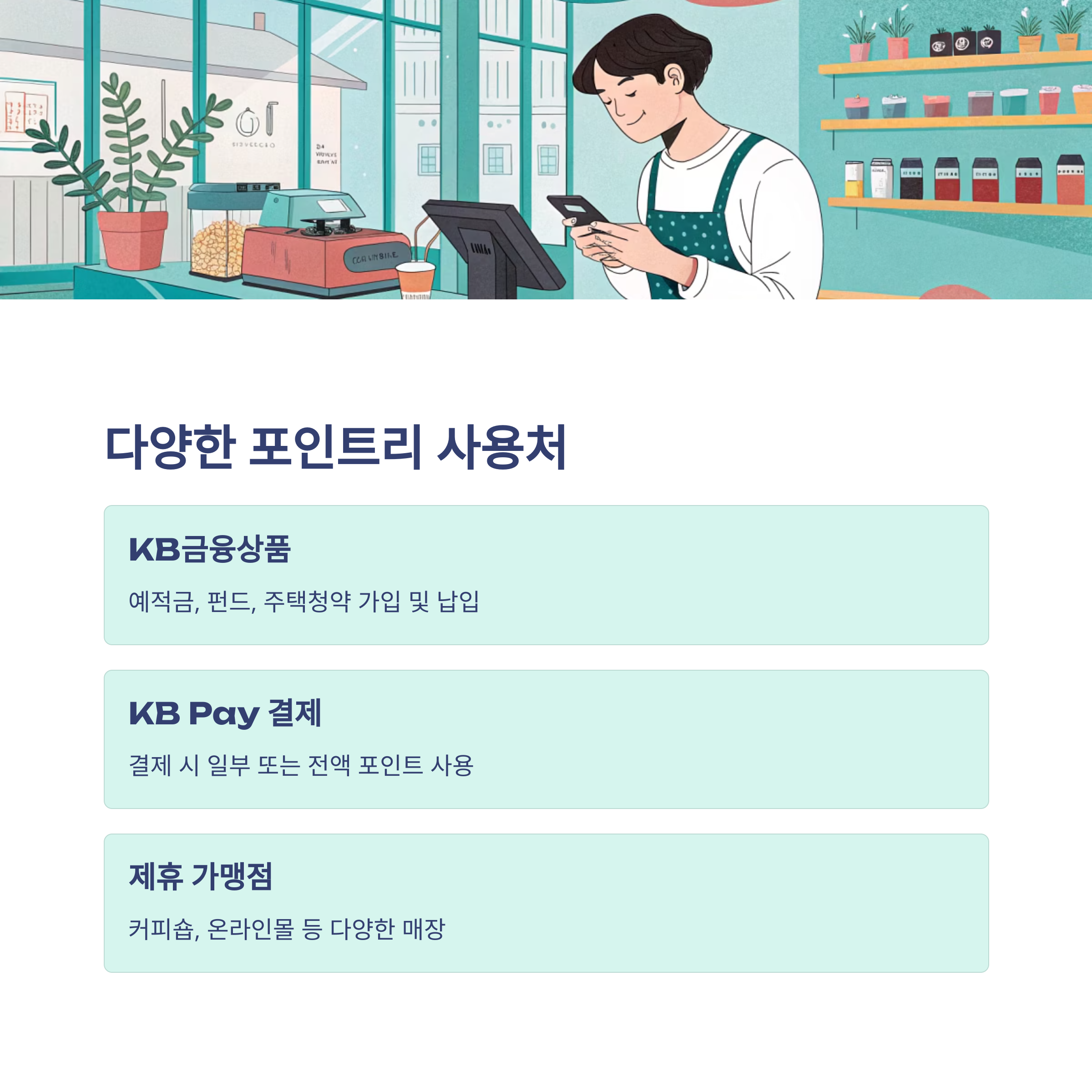- 오프라인 매장: KB Pay 앱의 NFC 기능을 활용해 비접촉 결제